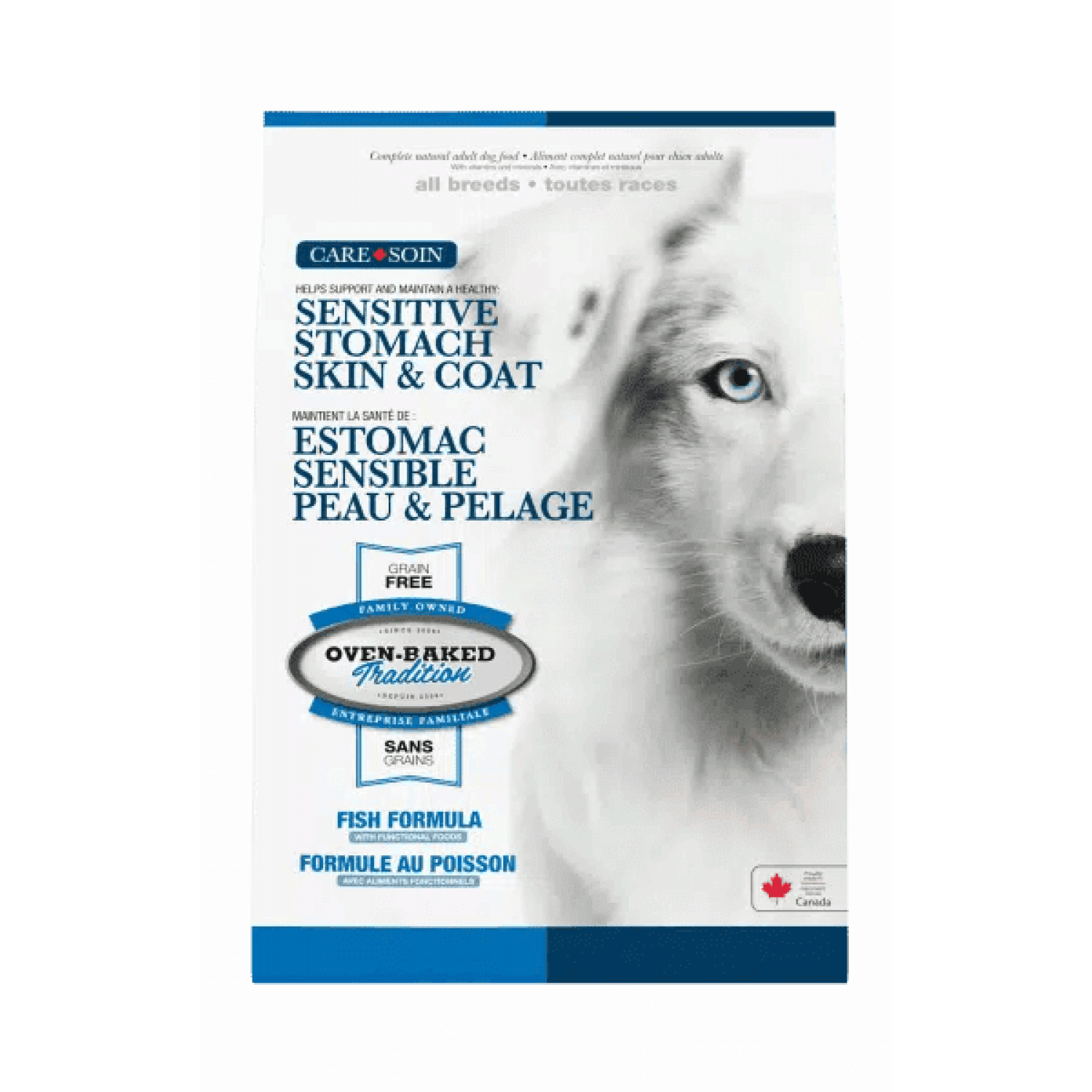 Oven-Baked Tradition Skin & Stomach - спеціально розроблена беззернова формула для собак, яка підтримує здорове травлення, імунітет та блискучу шерсть. Завдяки поєднанню функціональних інгредієнтів, вітамінів і мінералів, вона допомагає зменшити запалення кишечника (завдяки цеоліту), підтримує мікрофлору й імунну систему (завдяки постбіотикам), а також забезпечує сяючу шерсть і здорову шкіру завдяки свіжому оселедцю, лососю, омега-3, DHA та вітаміну С.