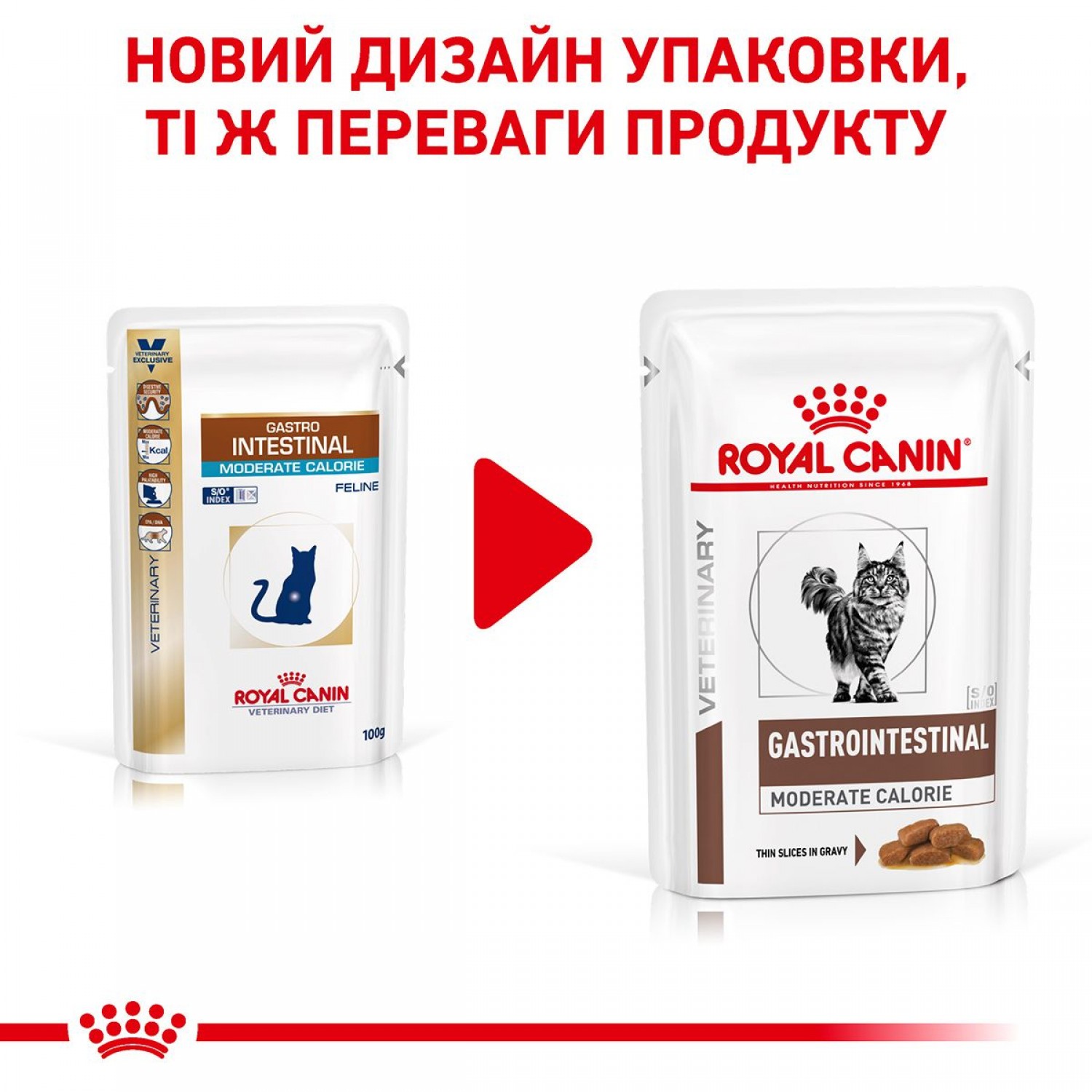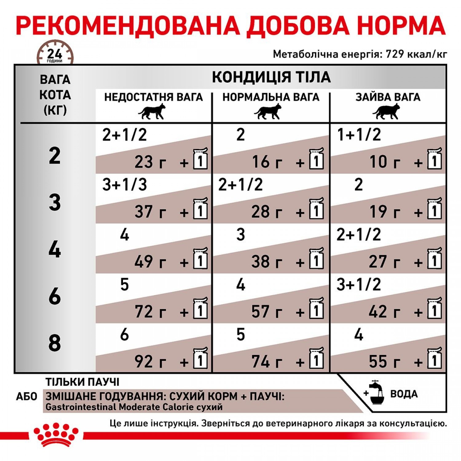 GASTROINTESTINAL MODERATE CALORIE— це повнораціонний дієтичний корм для котів. Рекомендується при гострих розладах шлунково-кишкового тракту, в реабілітаційний період та в період одужання.