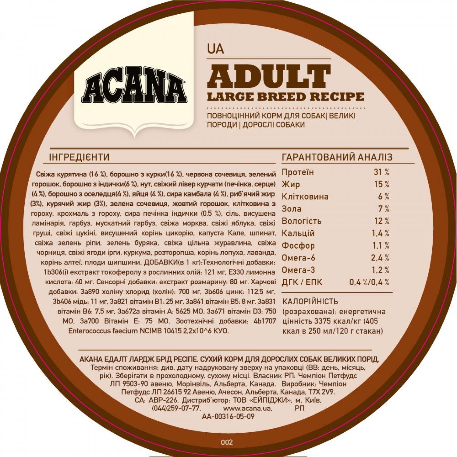 Рецептура приготована з якісних м’ясних інгредієнтів та збалансована овочами фруктами та травами, що доставляються на кухні компанії Champion Petfoods щоденно. Кожна порція корму Акана Едалт Лардж Брід Ресіпе забезпечує вашого собаку харчуванням, так якби воно прибувало до вас на кухню з фермерських ринків.