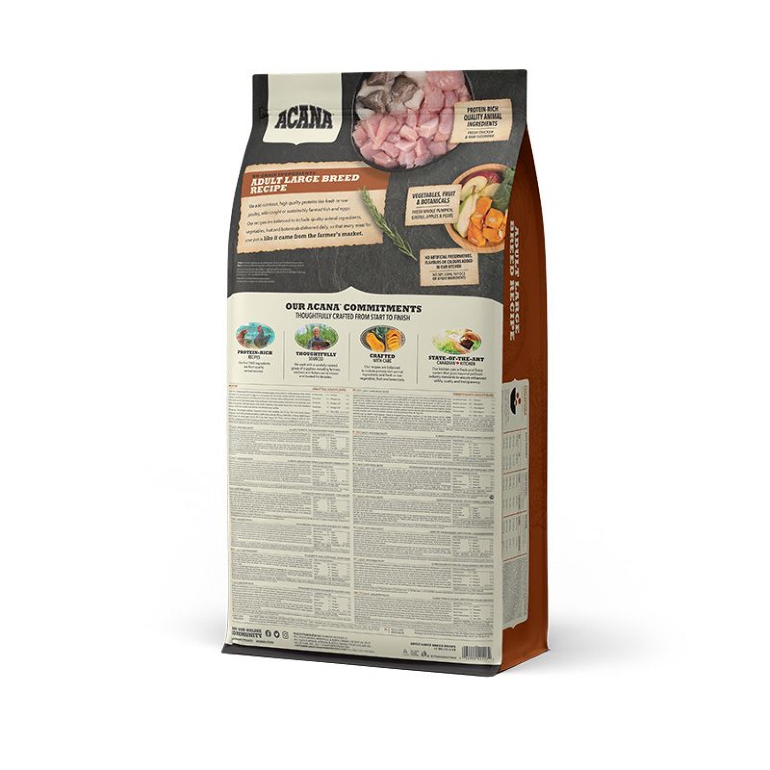 Рецептура приготована з якісних м’ясних інгредієнтів та збалансована овочами фруктами та травами, що доставляються на кухні компанії Champion Petfoods щоденно. Кожна порція корму Акана Едалт Лардж Брід Ресіпе забезпечує вашого собаку харчуванням, так якби воно прибувало до вас на кухню з фермерських ринків.