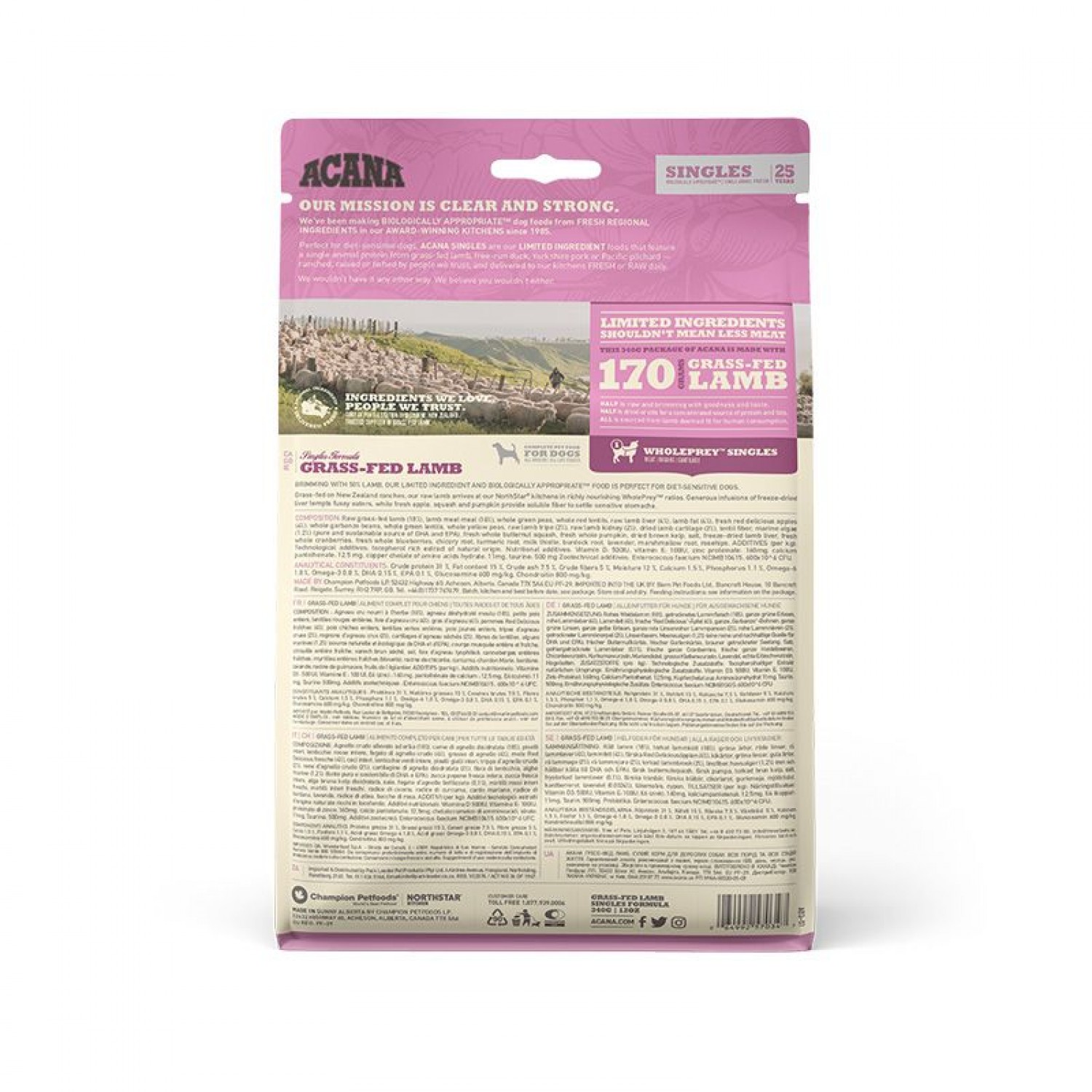 Виготовленні згідно стандартів Біологічної Відповідності на відзначених нагородами кухнях NorthStar з найкращих свіжих канадських інгредієнтів, ця лінія Біологічно Відповідних кормів ідеально підходить для собак вибагливих в їжі або з чутливим травленням. Раціон ACANA Grass-Fed Lamb створений у відповідності до рівнів поживності встановлених FEDIAF для собак всіх стадій житття включаючи цуценят великих порід в період зростання.