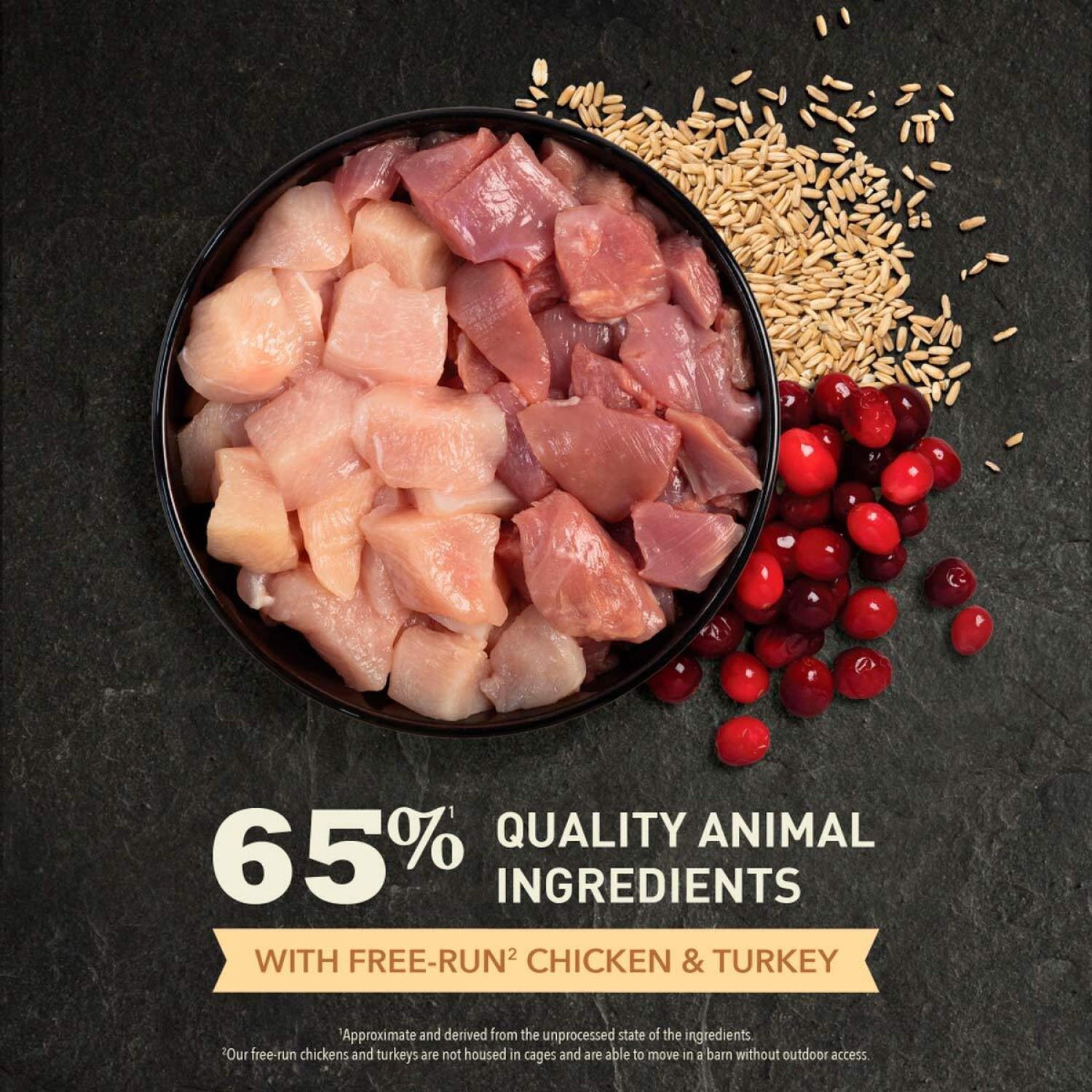 - На 65% складається з високоякісного м'яса курки та індички, вирощених на вільному вигулі, а також качки та гніздових яєць, тому корм має неповторний натуральний смак і насичений тваринним білком склад.