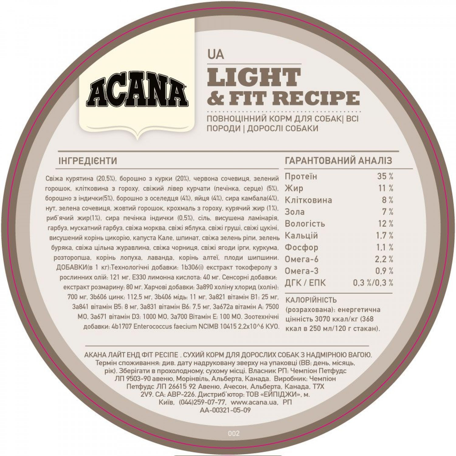 Коли це стосується корму ACANA, кожен інгредієнт має значення. Саме тому, рецептура Light & Fit  Recipe створюється з турботою щоб забезпечувати здорову вагу тіла собак. Рецептура АКАНА Лайт енд Фіт Ресіпе на 65% переповнена якісними м’ясними інгредієнтами, такими як м’ясо канадських курчат та сирої камбали та на 35% збалансована  фруктами, овочами та травами.