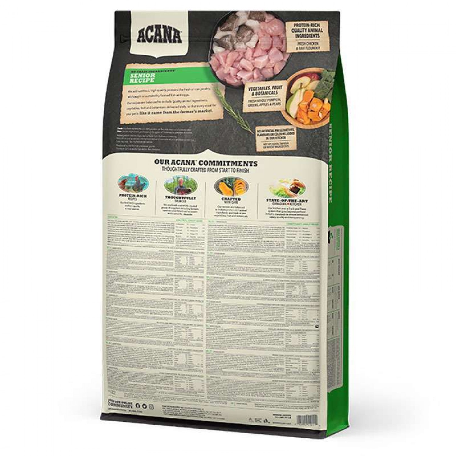 Рецептура приготована з якісних м’ясних інгредієнтів та збалансована овочами фруктами та травами, що доставляються на кухні компанії Champion Petfoods щоденно. Кожна порція корму АКАНА Сеньйор Ресіпе  забезпечує вашого собаку харчуванням, так якби воно прибувало до вас на кухню з фермерських ринків.
