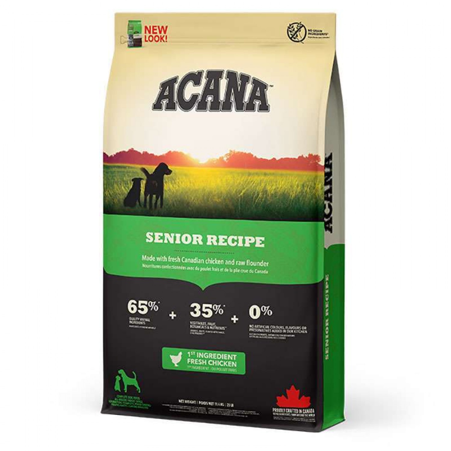 Коли це стосується корму  ACANA, кожен інгредієнт має значення. Саме тому, рецептура Senior Recipe створюється з турботою щоб забезпечувати здоров’я старіючих собак. Рецептура АКАНА Сеньйор Ресіпе  на 65% переповнена якісними м’ясними інгредієнтами, такими як м’ясо канадських курчат та сирої камбали та на 35%  збалансована  фруктами, овочами та травами.