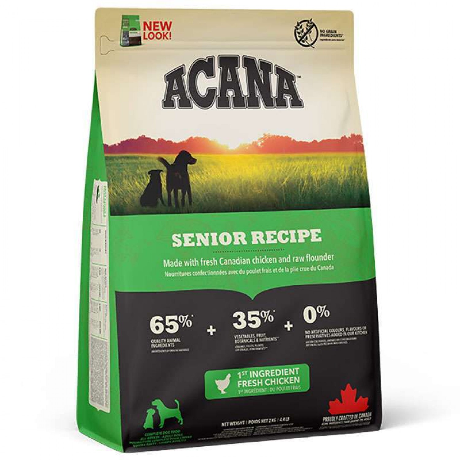 Коли це стосується корму ACANA, кожен інгредієнт має значення. Саме тому, рецептура Senior Recipe створюється з турботою щоб забезпечувати здоров’я старіючих собак. Рецептура АКАНА Сеньйор Ресіпе на 65% переповнена якісними м’ясними інгредієнтами, такими як м’ясо канадських курчат та сирої камбали та на 35% збалансована фруктами, овочами та травами.