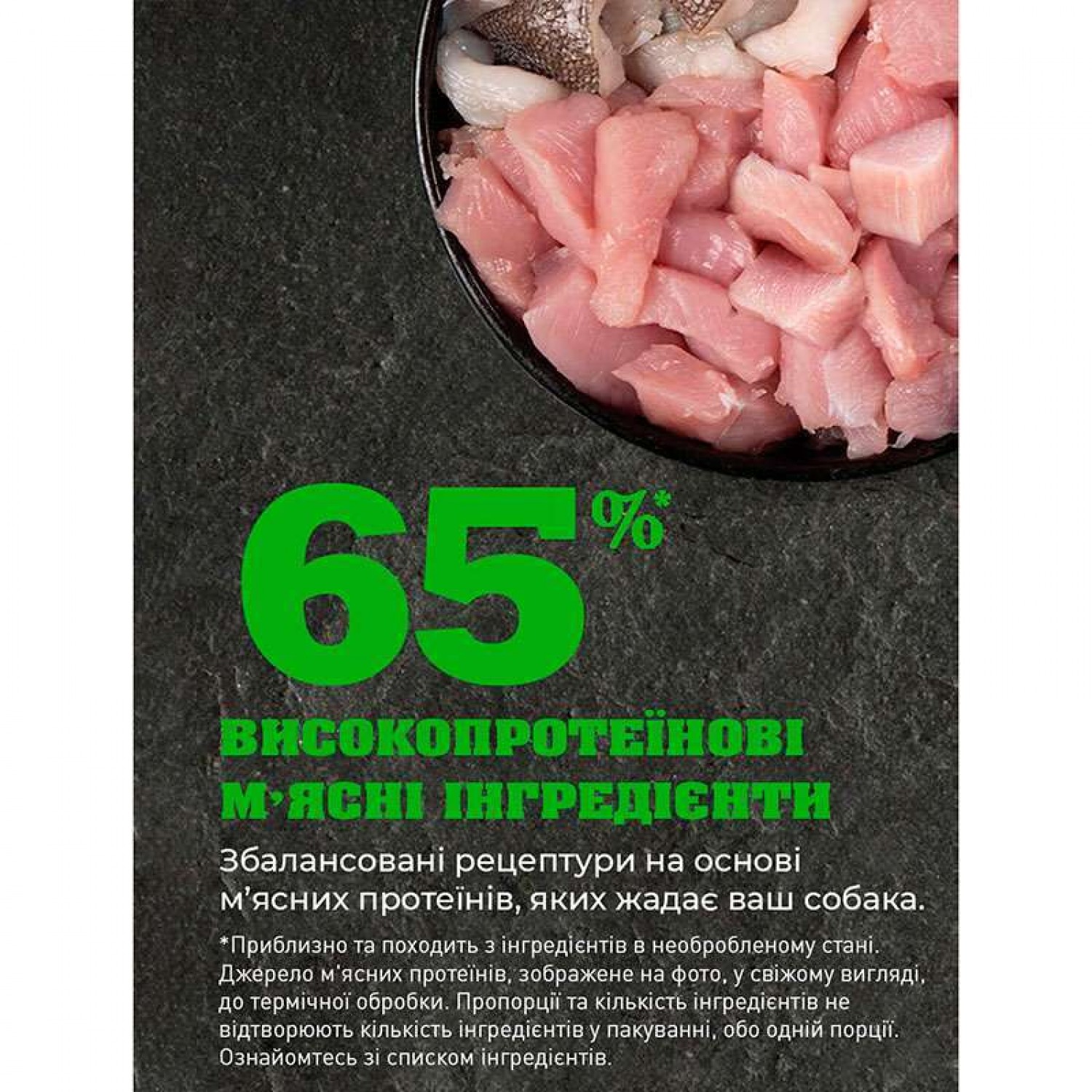 - Містить м'ясо птиці, органи та хрящі - забезпечують надходження нутрієнтів у найбільш натуральній та поживній формі. М'язові тканини забезпечують тварину білками і жирами, печінка, нирки і шлунок - вітамінами і мінералами, кістки і хрящі - кальцієм і фосфором.