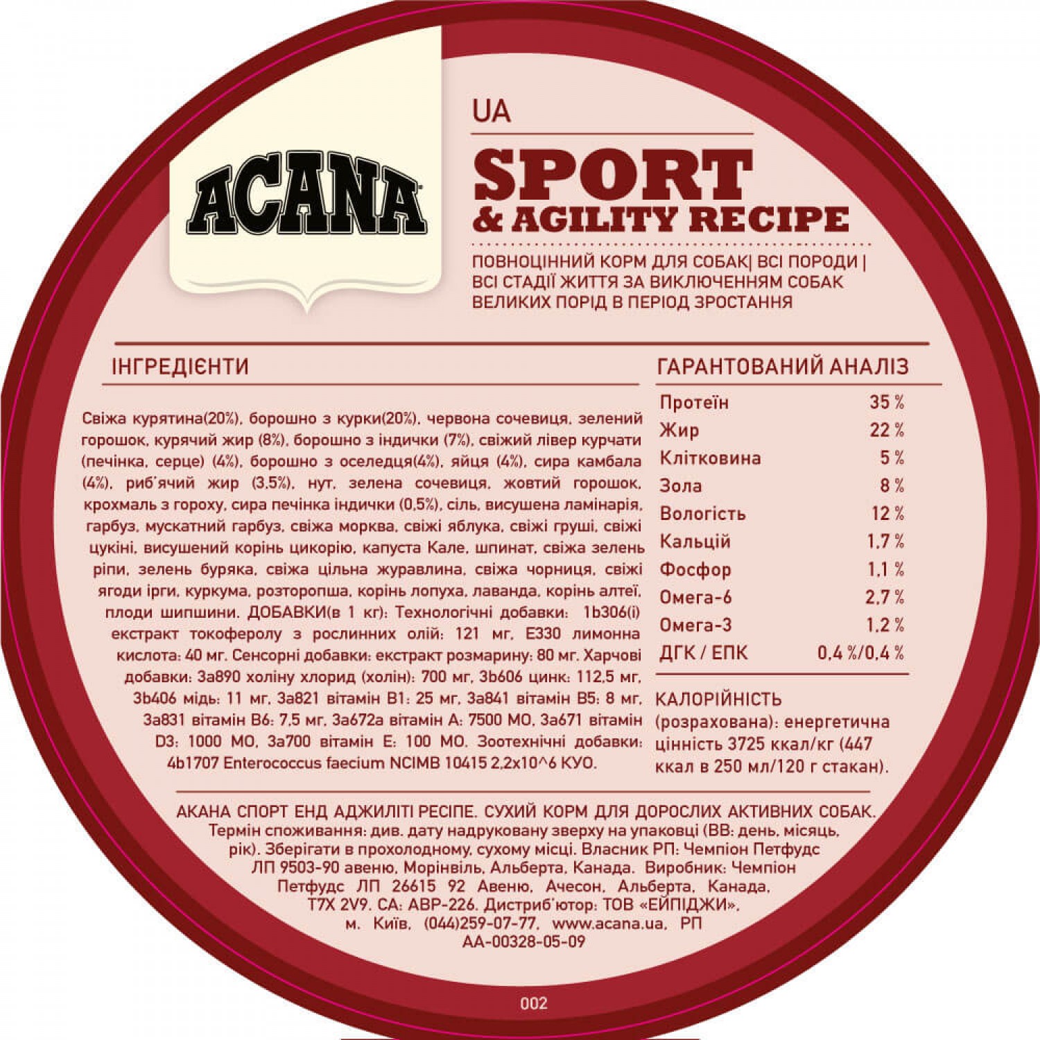 Коли це стосується корму ACANA, кожен інгредієнт має значення. Саме тому рецептура корму ACANA Sport & Agility Recipe створюється з турботою, щоб забезпечувати всі потреби дорослих активних собак у харчуванні. Рецептура АКАНА Спорт енд Аджиліті Ресіпе на 75 % переповнена якісними м'ясними інгредієнтами, такими як м'ясо канадських курчат та сирої камбали та на 25 % збалансована фруктами, овочами та травами.