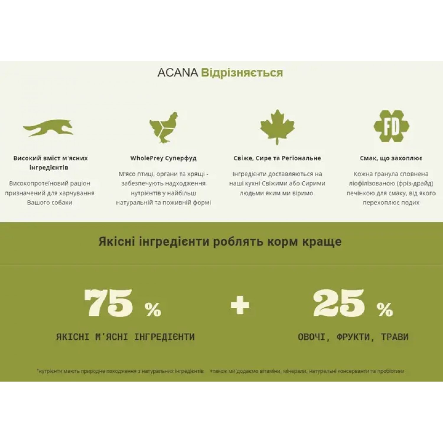 Рецептура виготовлена з якісних м'ясних інгредієнтів та збалансована фруктами та травами, які доставляються на кухні компанії Champion Petfoods щодня. Кожна порція корму АКАНА Спорт енд Аджиліті Ресіпе забезпечує вашого собаку харчуванням, так якби воно прибувало до вас на кухню з фермерських ринків.