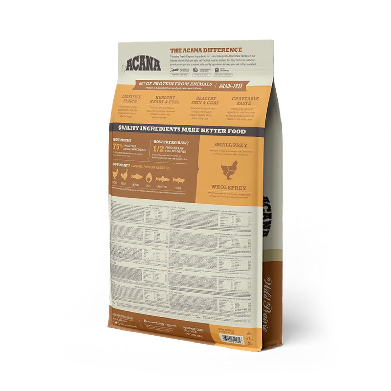 Котам необхідні раціони з багатим вмістом м'ясних протеїнів. Надихаючись нашими великими преріями і кришталевими озерами, рецептура ACANA Wild Prairie переповнена м'ясними інгредієнтами високої якості: м'ясом курчат і індички, вирощених на вільному вигулі, гніздовими яйцями і прісноводною рибою, виловленою в дикій природі.