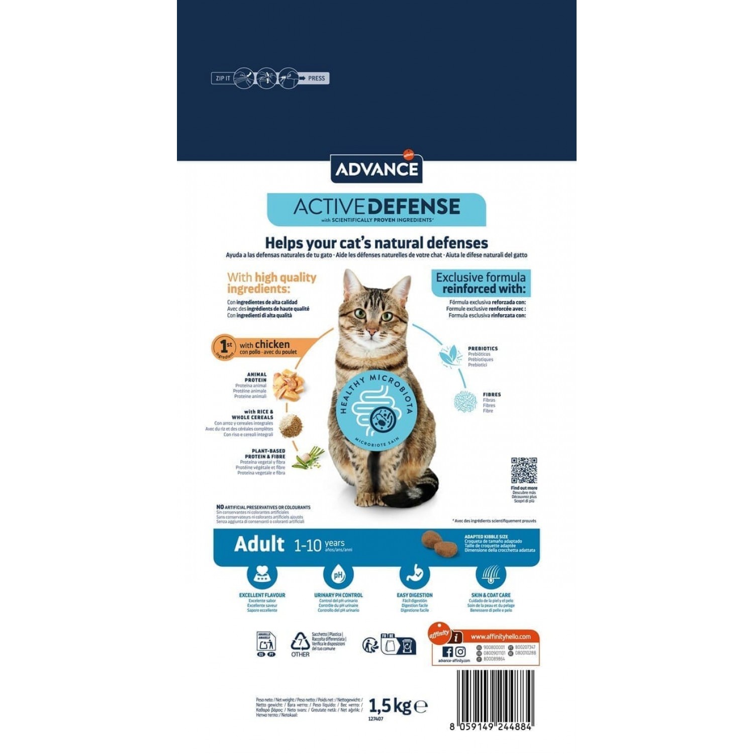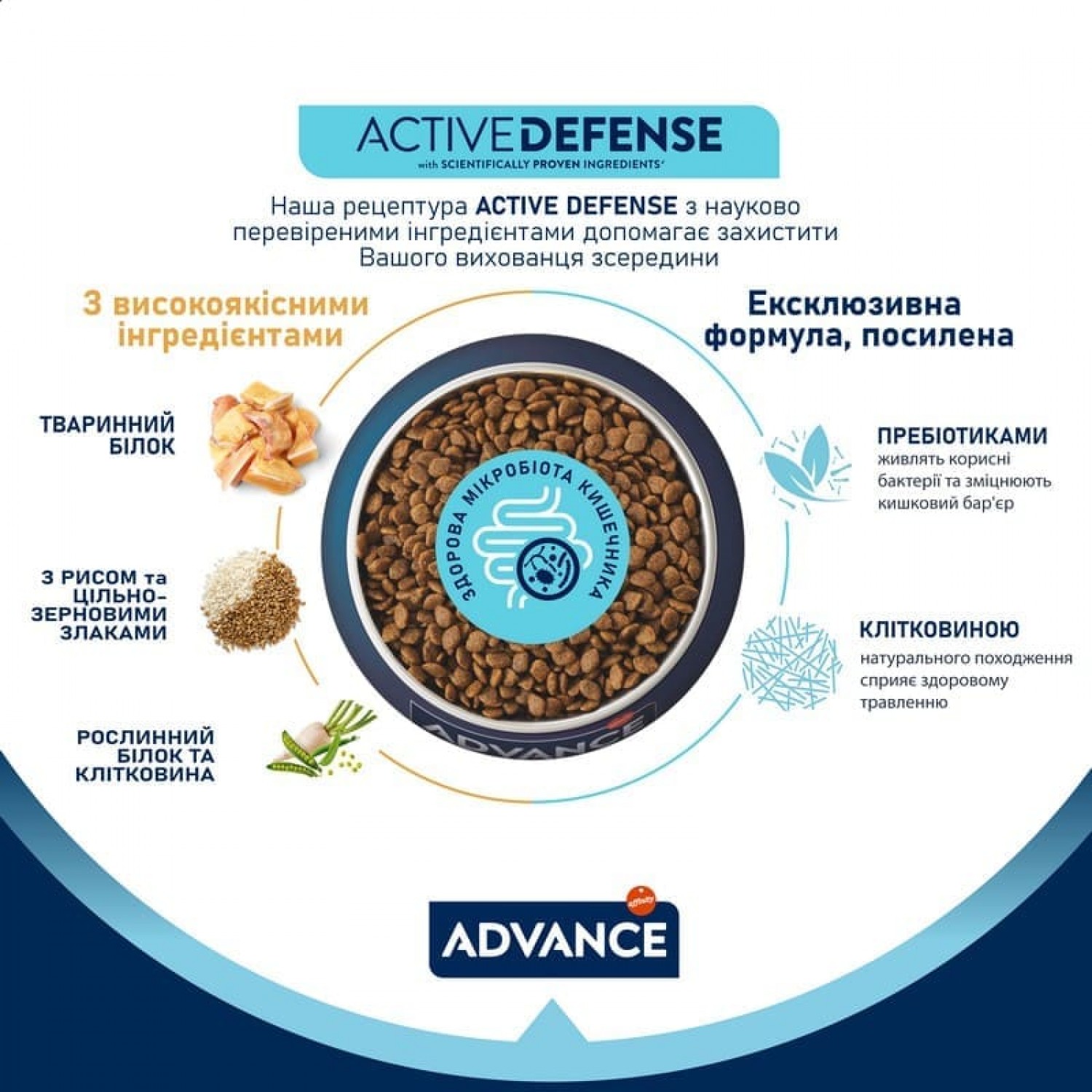 Формула Active Defense у кормах ADVANCE - це науково розроблена система підтримки природного імунітету кота. Завдяки поєднанню пробіотиків, пребіотиків, натуральної клітковини та імуноглобулінів, вона сприяє здоровому травленню, покращує баланс кишкової мікрофлори та підсилює захисні функції організму. Це допомагає вашому улюбленцю краще засвоювати поживні речовини та протистояти зовнішнім чинникам, забезпечуючи йому активне і здорове життя щодня.