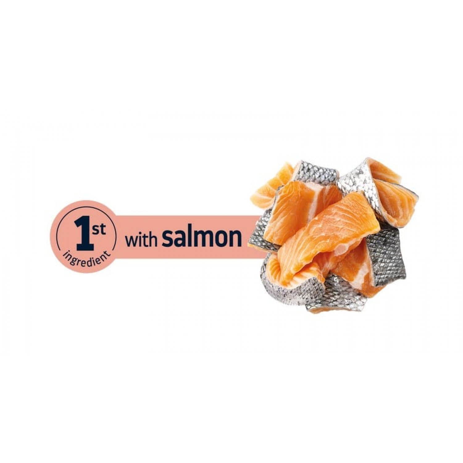 Склад: лосось (18%), кукурудзяний білок, цільнозернова пшениця, рис (10%), білок пшениці, дегідровані лососеві білки, дегідрований горох, тваринний жир, мінерали, картопляний протеїн, буряковий жом, горохова клітковина, пшенична крупка, гідролізовані дріжджі, порошок целюлози, інулін цикорію (0,6%). З антиоксидантами.