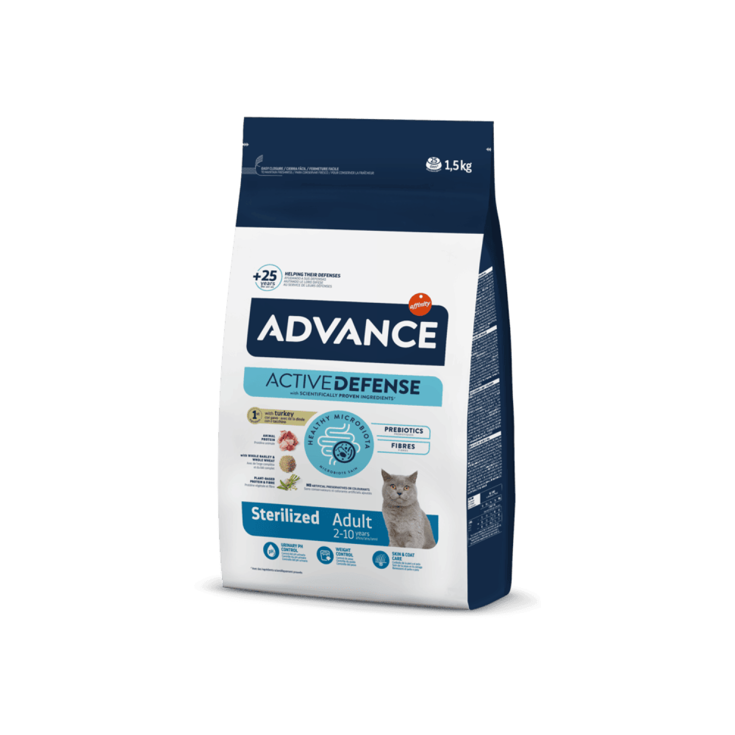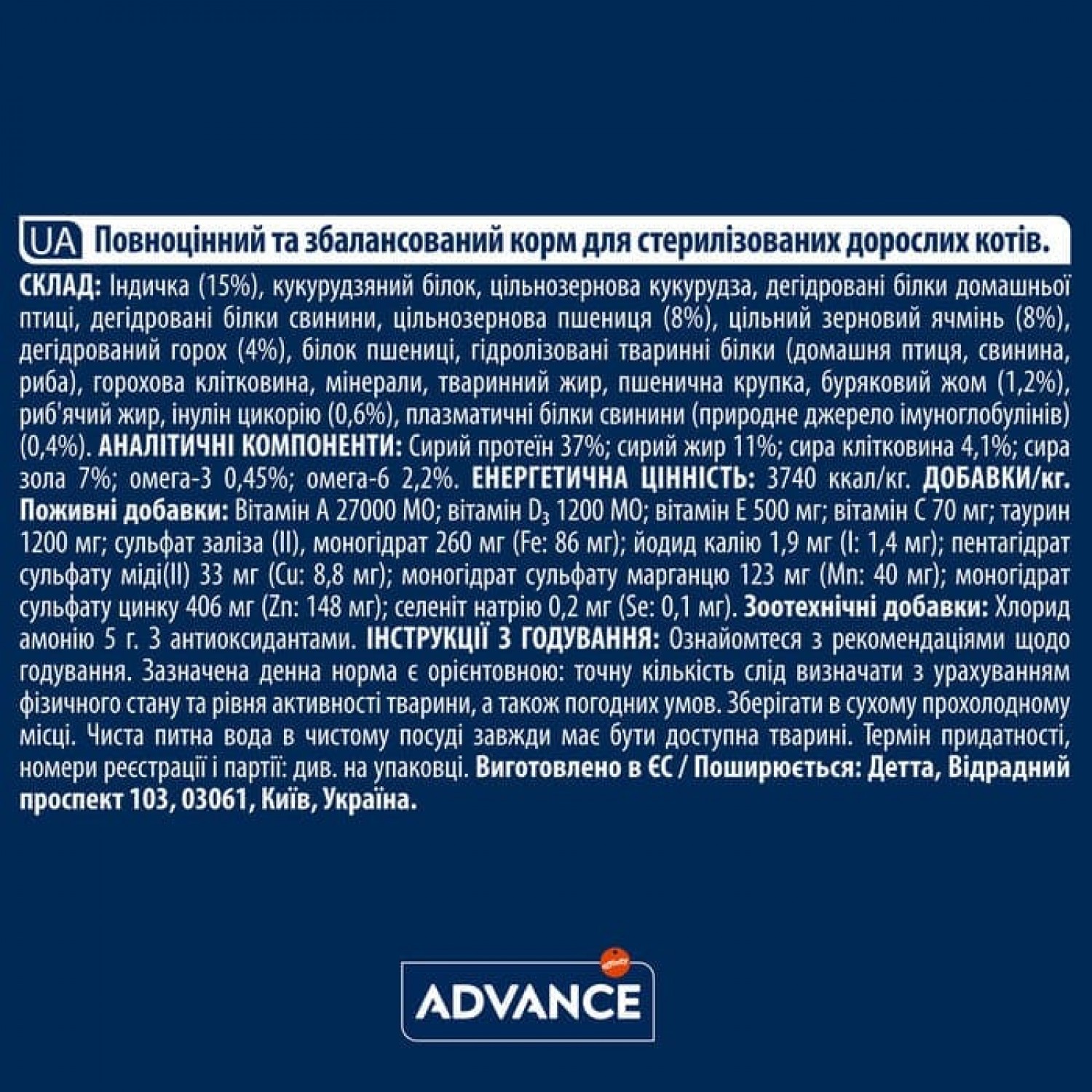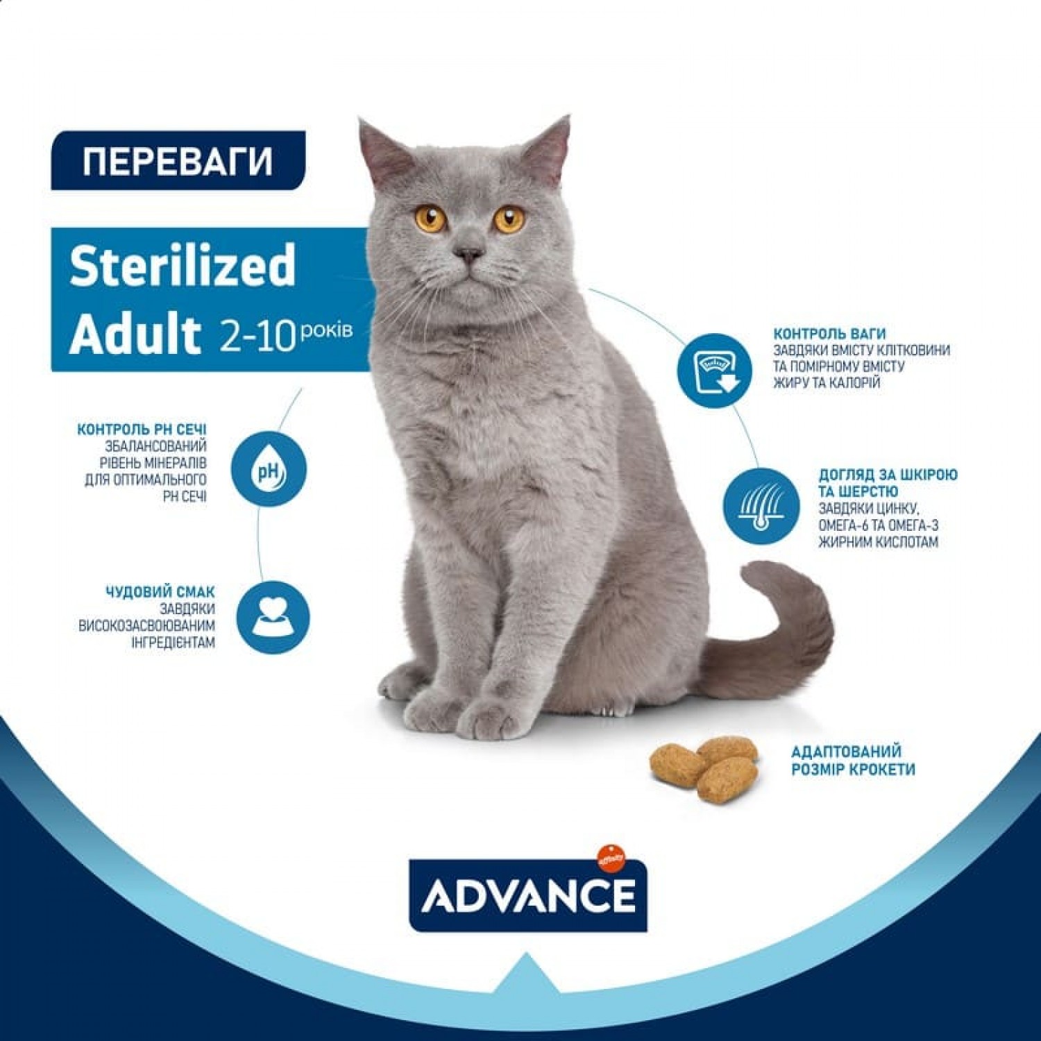 Advance Cat Sterilized  - це повнораціонний збалансований корм, спеціально розроблений для стерилізованих котів. Його формула враховує змінені харчові потреби тварин після стерилізації, допомагаючи підтримувати здорову вагу, належний обмін речовин і загальний стан здоров’я. Він не лише допомагає контролювати вагу, а й сприяє підтримці здоров’я сечової системи, підвищує загальне самопочуття та забезпечує комфортне життя стерилізованому коту.
