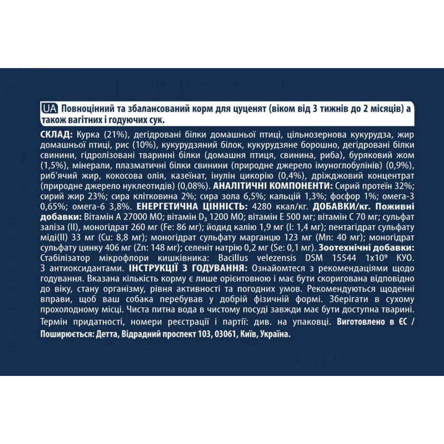 - Збалансований раціон із високим вмістом білків, жирів та інших поживних речовин для забезпечення здорового зростання та розвитку цуценяти.