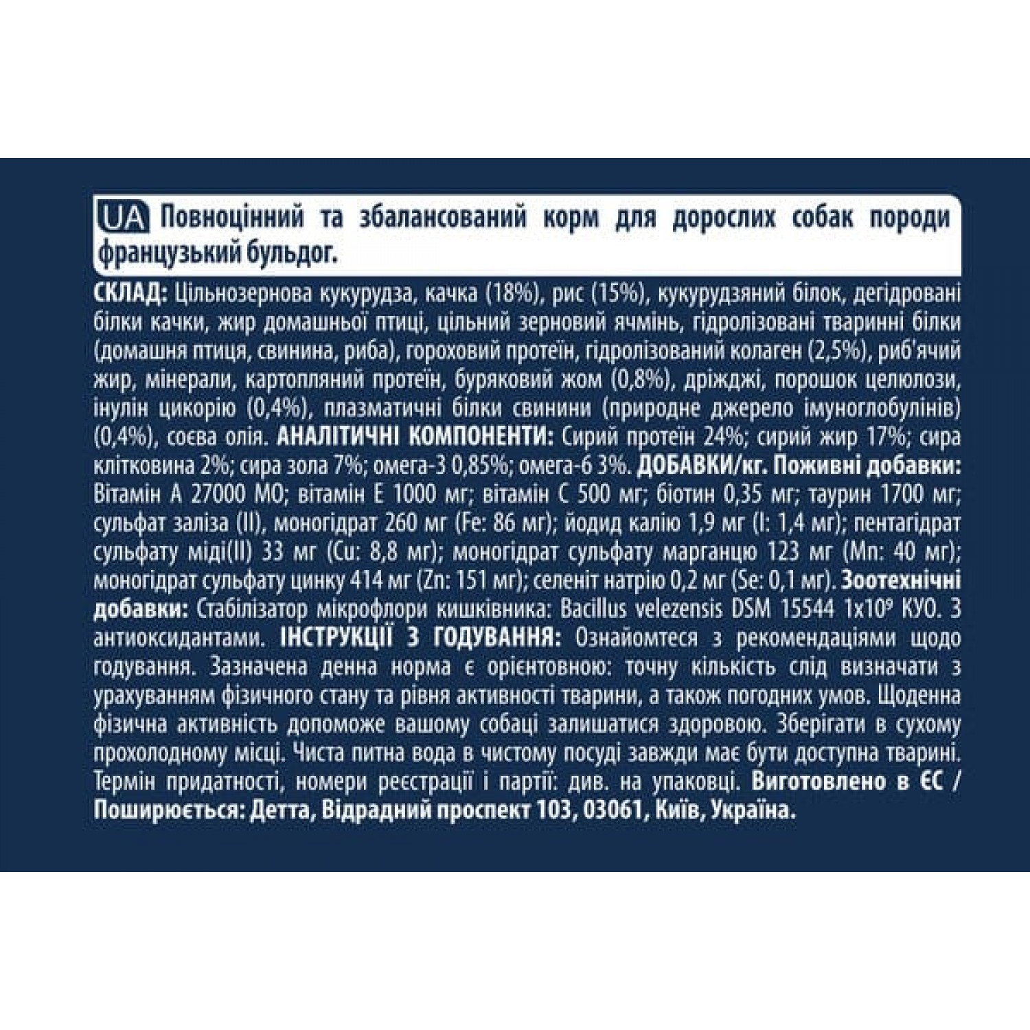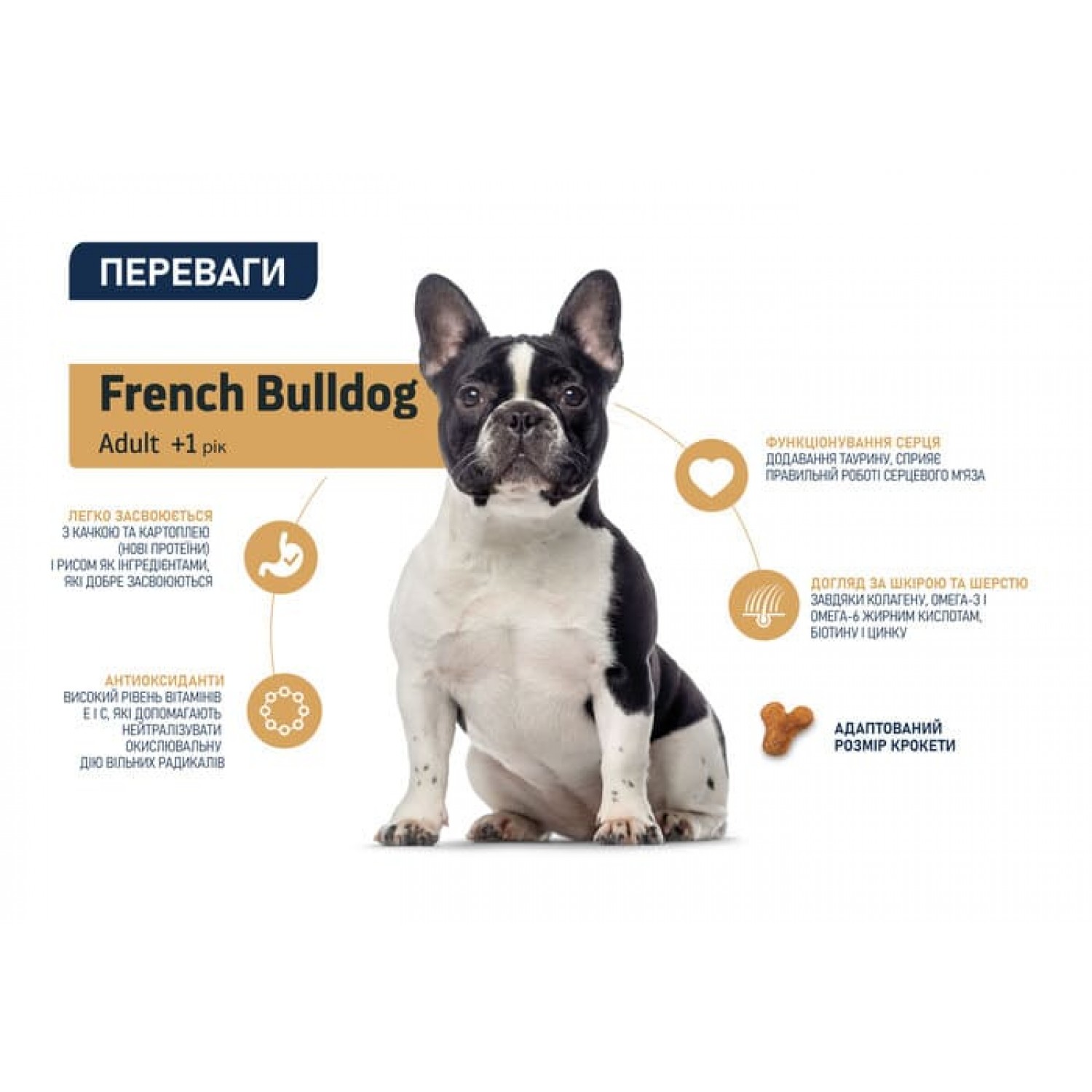 Спеціальна структура гранул адаптована для собак породи французький бульдог.