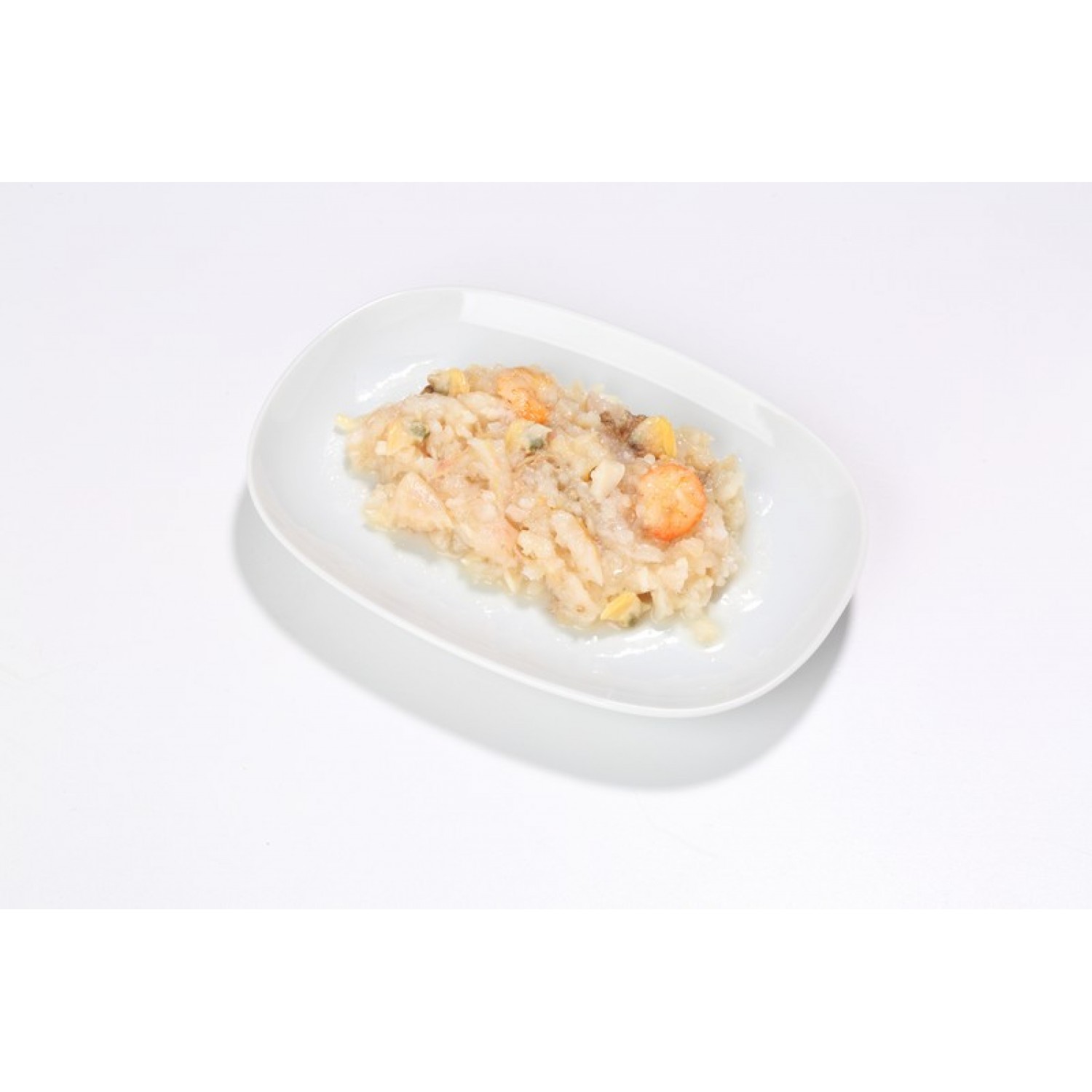 Склад: рибний бульйон 43,5%, біла риба 30%, дрібні молюски 11%, кальмари 7%, креветки 7%, рис 1,5%. Без добавок.