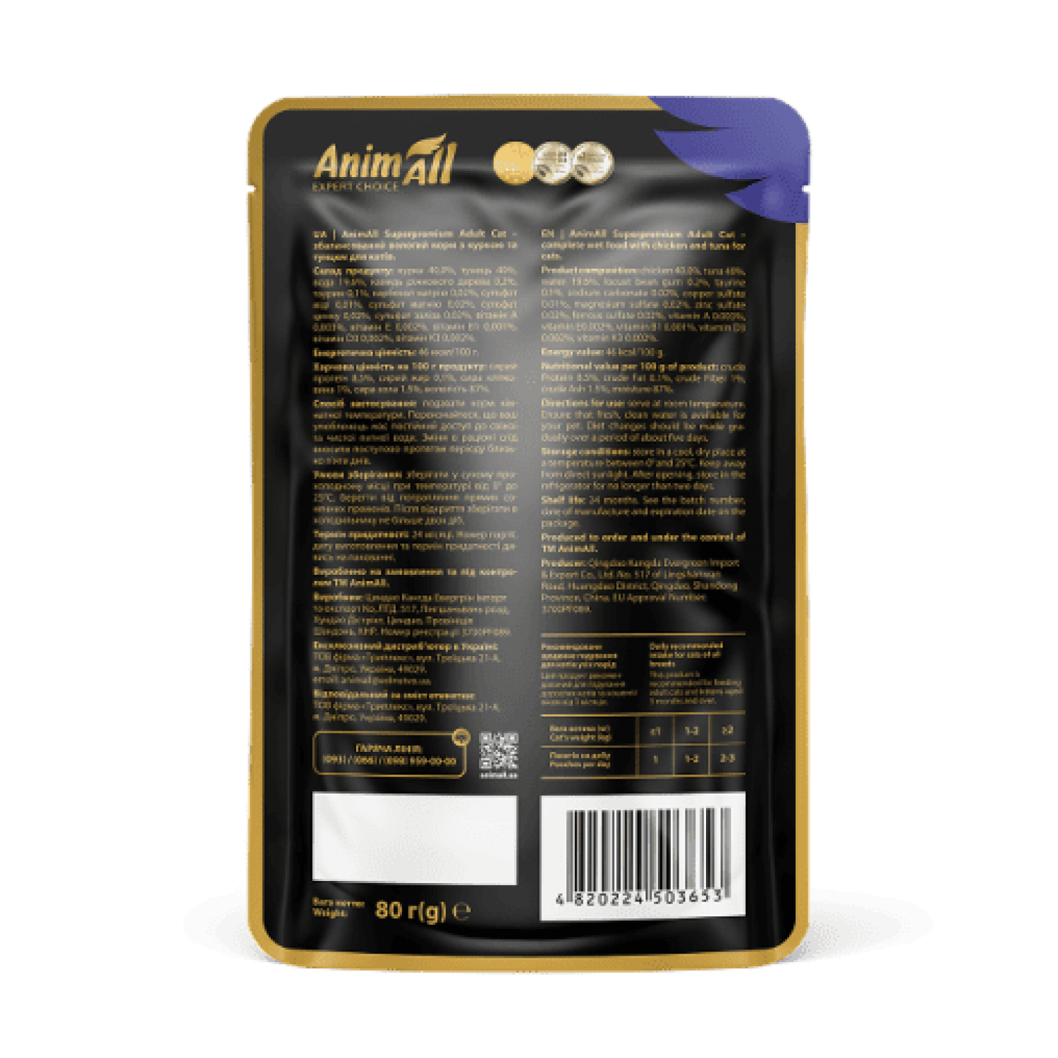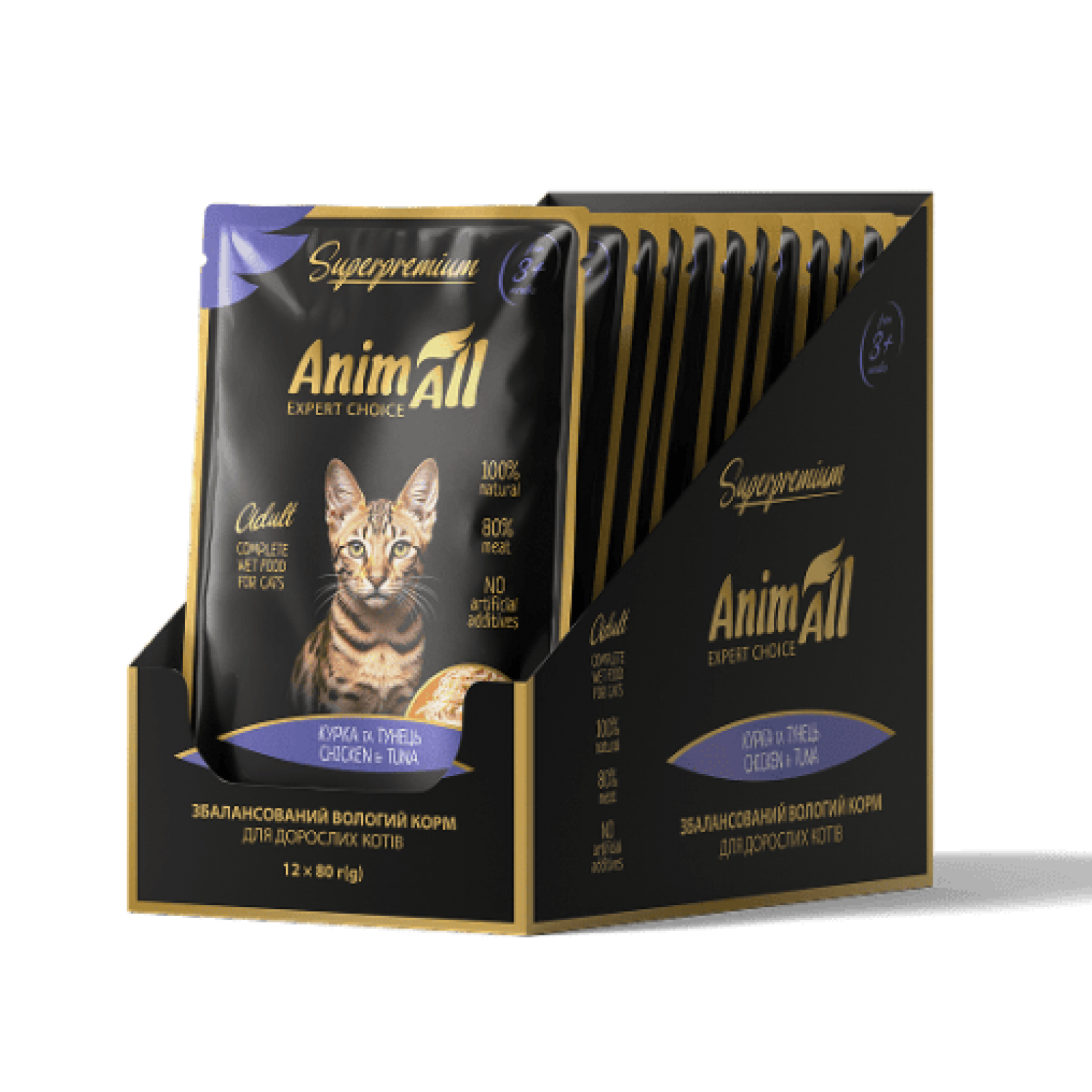 AnimAll Вологий корм Тунець з куркою - це гармонія смаку та користі, створена спеціально для справжніх котячих гурманів. Вишукане поєднання ароматного тунця (40%) та соковитої курки (40%) перетворює кожне годування на справжню насолоду. Цей ніжний та натуральний корм не лише задовольнить найвибагливіший смак вашого улюбленця, а й забезпечить його організм усім необхідним для здоров’я, енергії та активного життя.