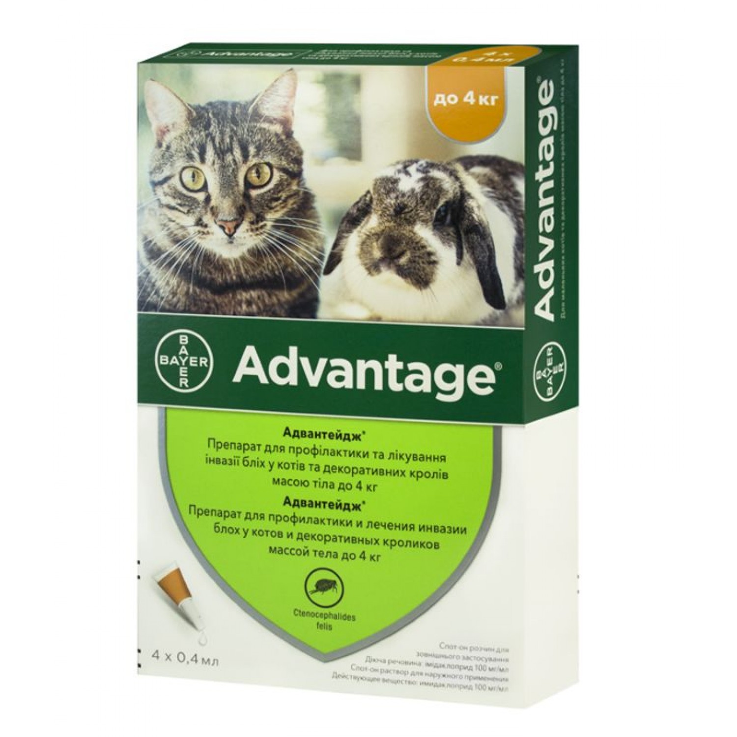 Для тварин вагою до 4 кг застосовують 1 піпетку Адвантейдж 40 (0,4 мл)