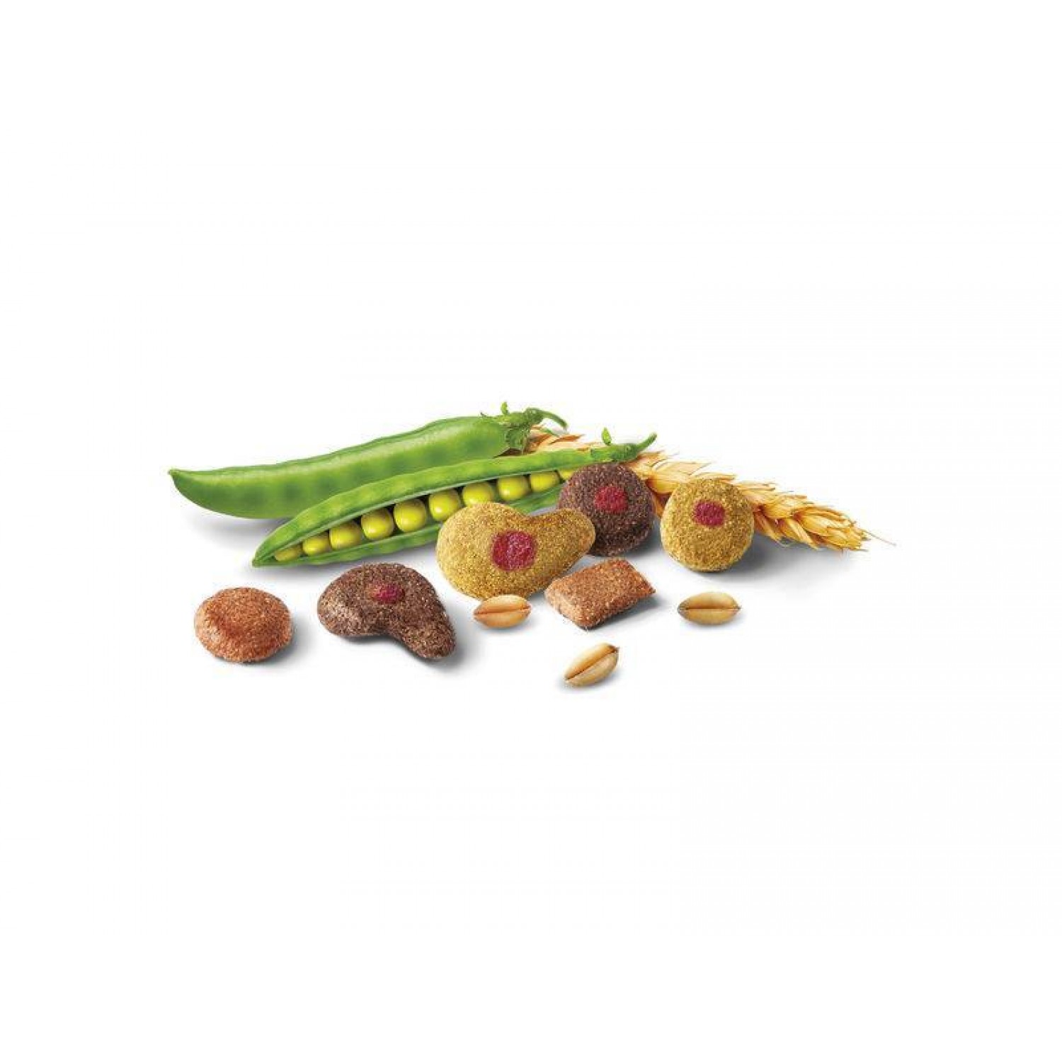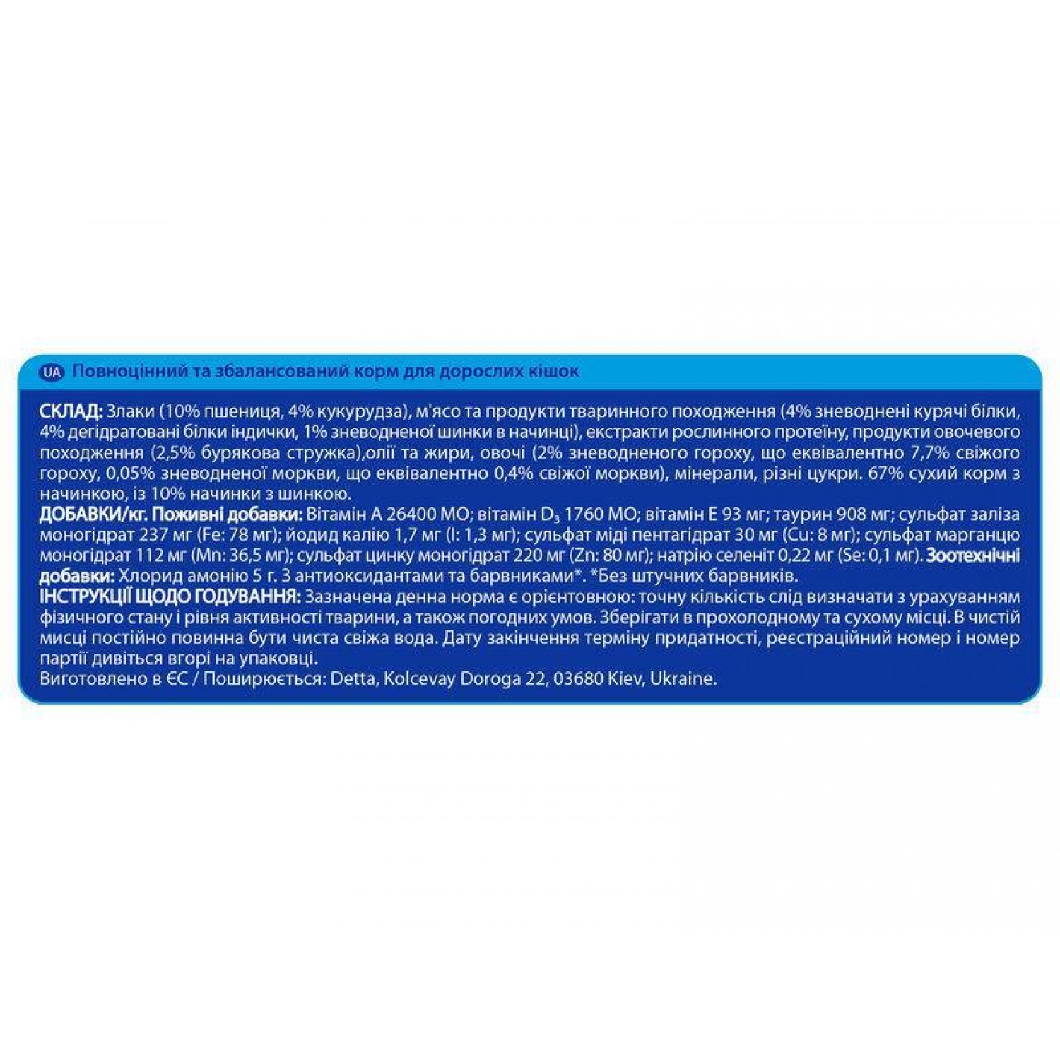 Склад: злаки (10% пшениця, 4% кукурудза), м'ясо та продукти тваринного походження (4% зневодненого курячого білка, 4% дегідратованого білка індички, 1% знезводненої шинки в начинці), екстракти рослинного протеїну, продукти овочевого походження (2,5% бурякова стружка), олії та жири, овочі (2% зневодненого гороху, що еквівалентно 7,7% свіжого гороху, 0,05% знезводненої моркви, що еквівалентно 0,4% свіжої моркви), мінерали, різні цукри, антиоксиданти та натуральні барвники. 67% сухий корм із начинкою, з 10% начинки з шинкою.