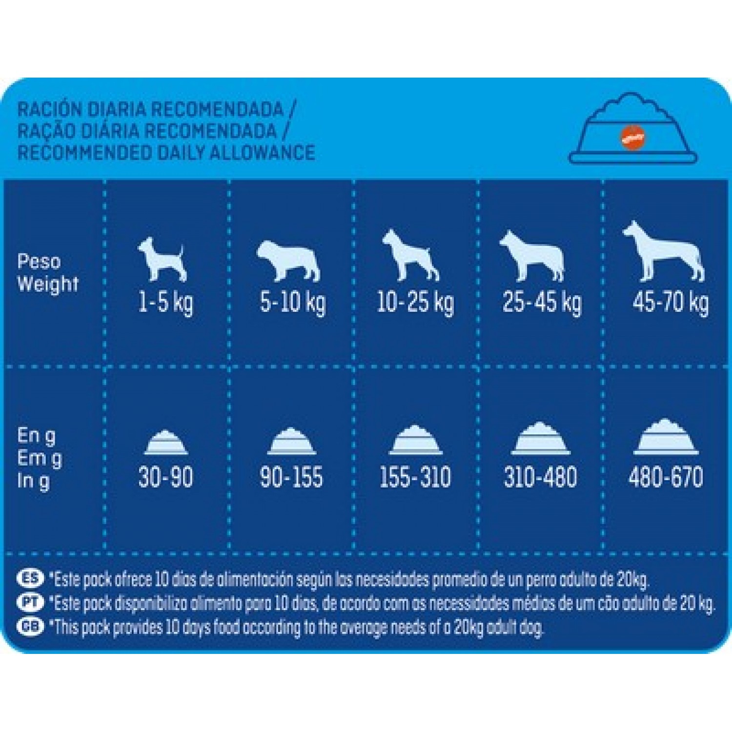 Дотримуйтеся норм годування, зазначених у таблиці на пакованні, але враховуйте індивідуальні потреби собаки.