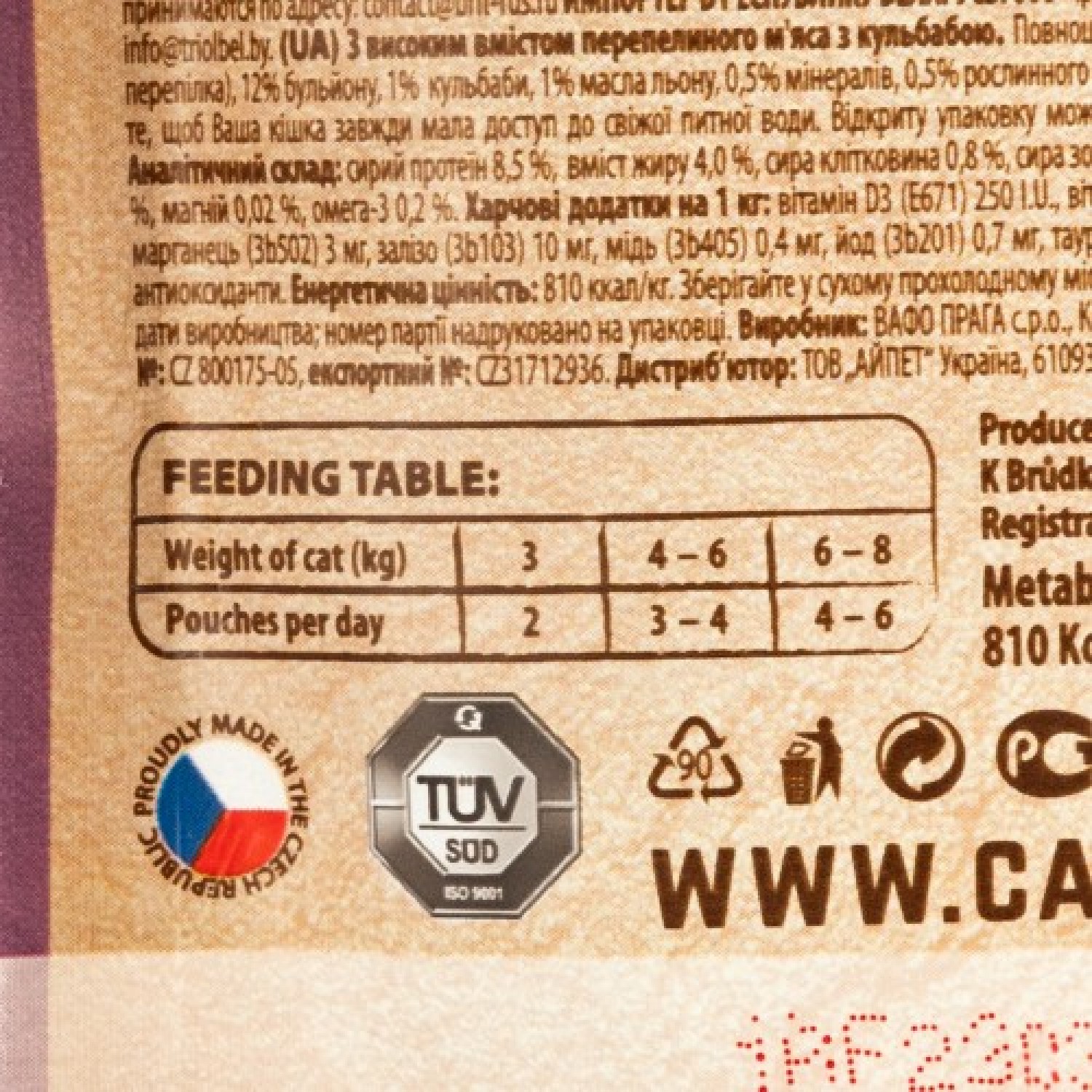 Carnilove rich in Quail enriched with Dandelion (філе дичини в соусі) - повноцінний вологий корм класу холістик для котів. Цей раціон можна використовувати, як основну страву або як доповнення до сухого корму - для надання йому апетитності.