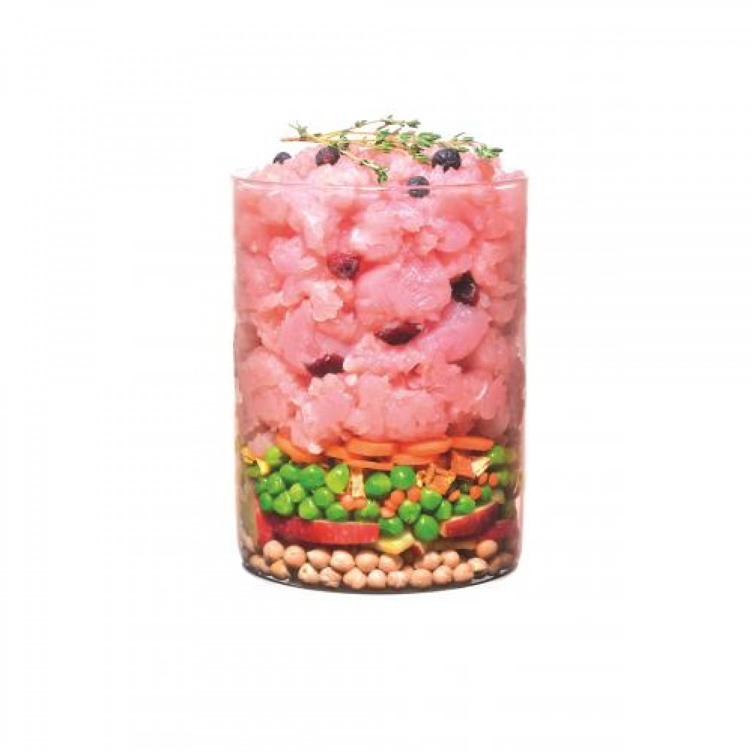 - У складі корму 60% свіжого м’яса та 40% овочів, фруктів, зелені, суперфудів.