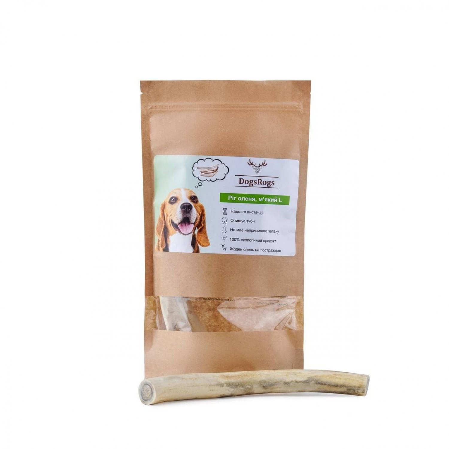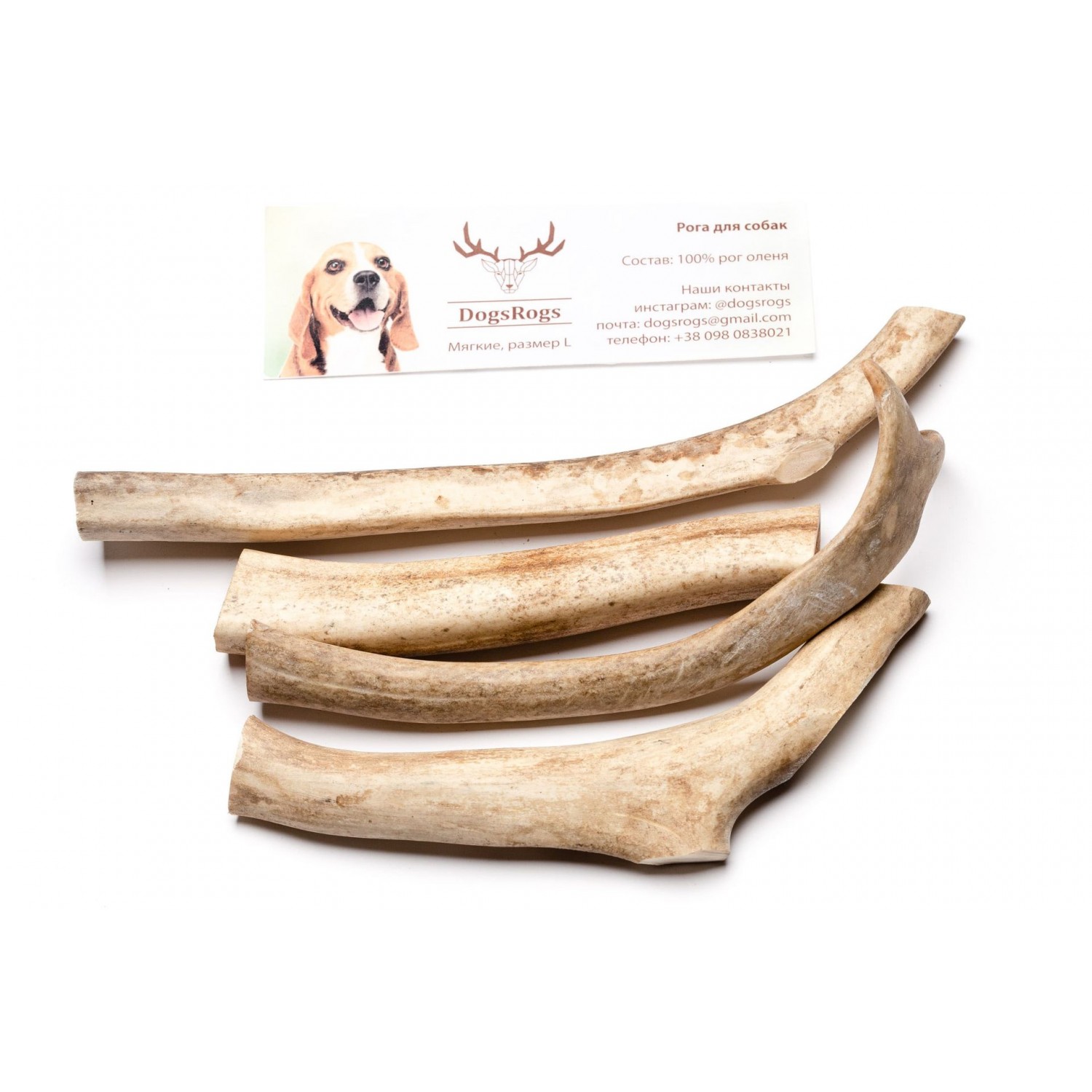 Ріг оленя м‘який, розмір L підійде для cередніх собак з низьким рівнем гризучості масою 15-35 кг, або для цуценят з більшим рівнем гризучості.