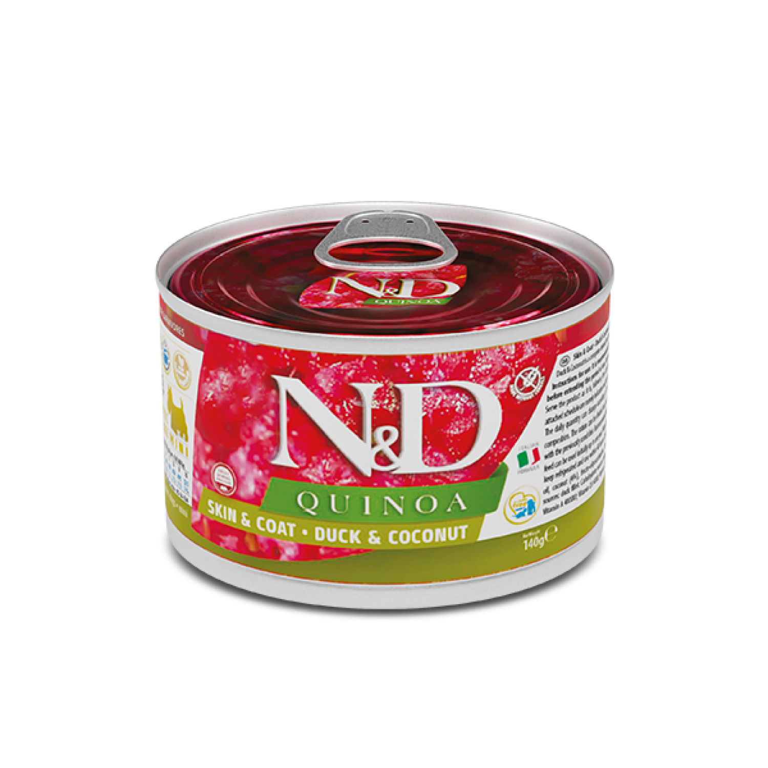 Farmina N&D Quinoa Dog Adult Mini Skin & Coat вологий корм для собак дрібних порід при харчовій алергії з качкою, кіноа, кокосом і куркумою.