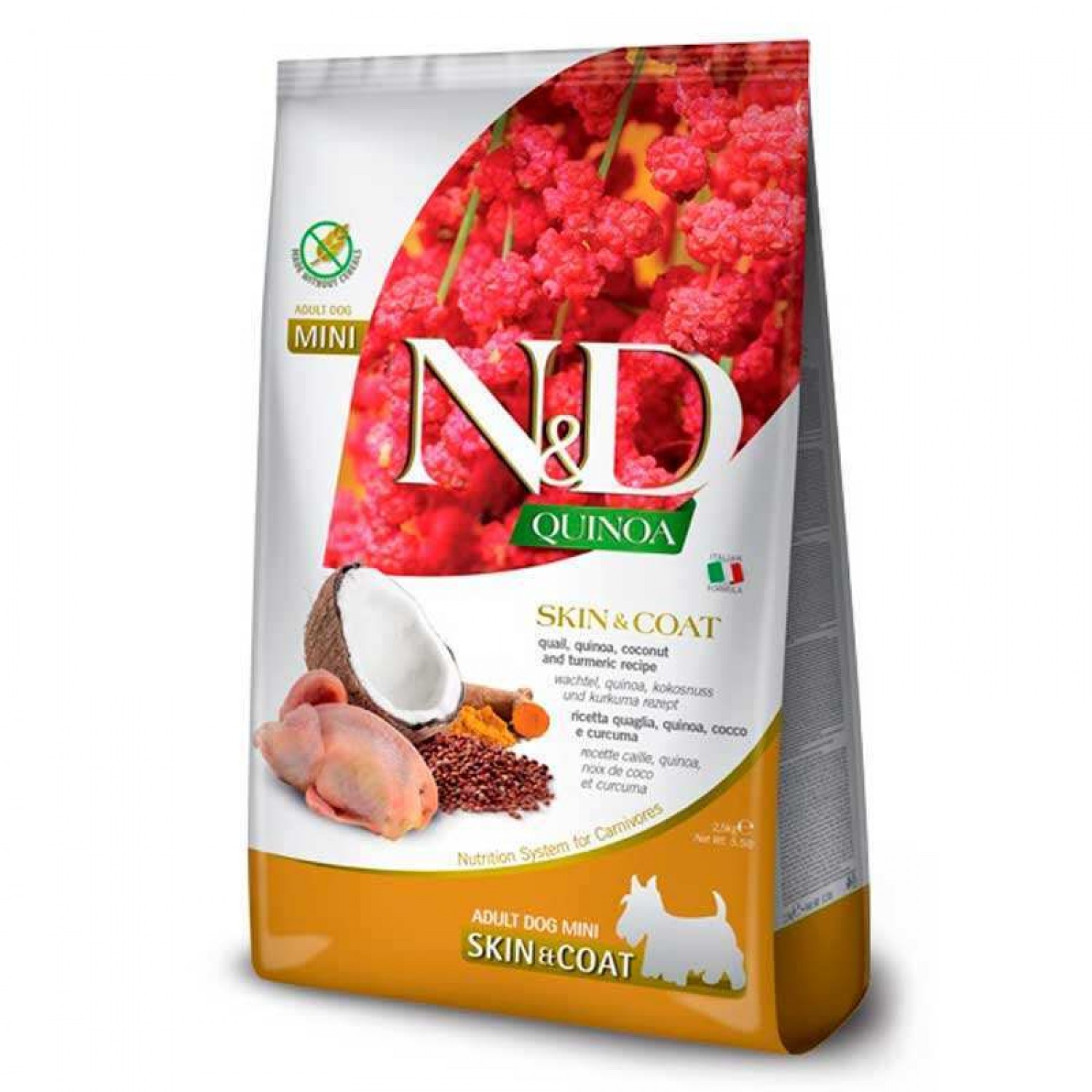 Сухий беззерновий корм із перепілкою розроблений спеціально для дорослих собак малих порід. Маленькі собаки мають чутливу харчову систему та часто схильні до харчової непереносимості. Виробник Farmina (Італія) подбав про те, щоб власники малюків мали можливість підібрати для своїх вихованців якісний повнораційний корм, що не викликає алергії. Farmina N & D Quinoa GF Skin & Coat Adult Min не містить глютена, як основне джерело білка виступає дієтичне м'ясо перепілки, доповнене невеликою кількістю дегідрованого білка курки, індички, ягнятини, свинини та яловичини.