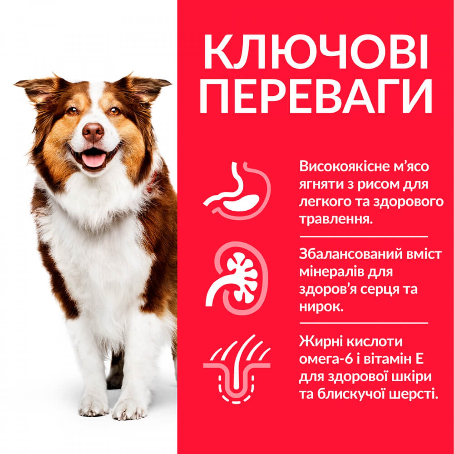 - Містить збалансований рівень мінералів для здоров’я серця, нирок і сечового міхура собак середніх порід.