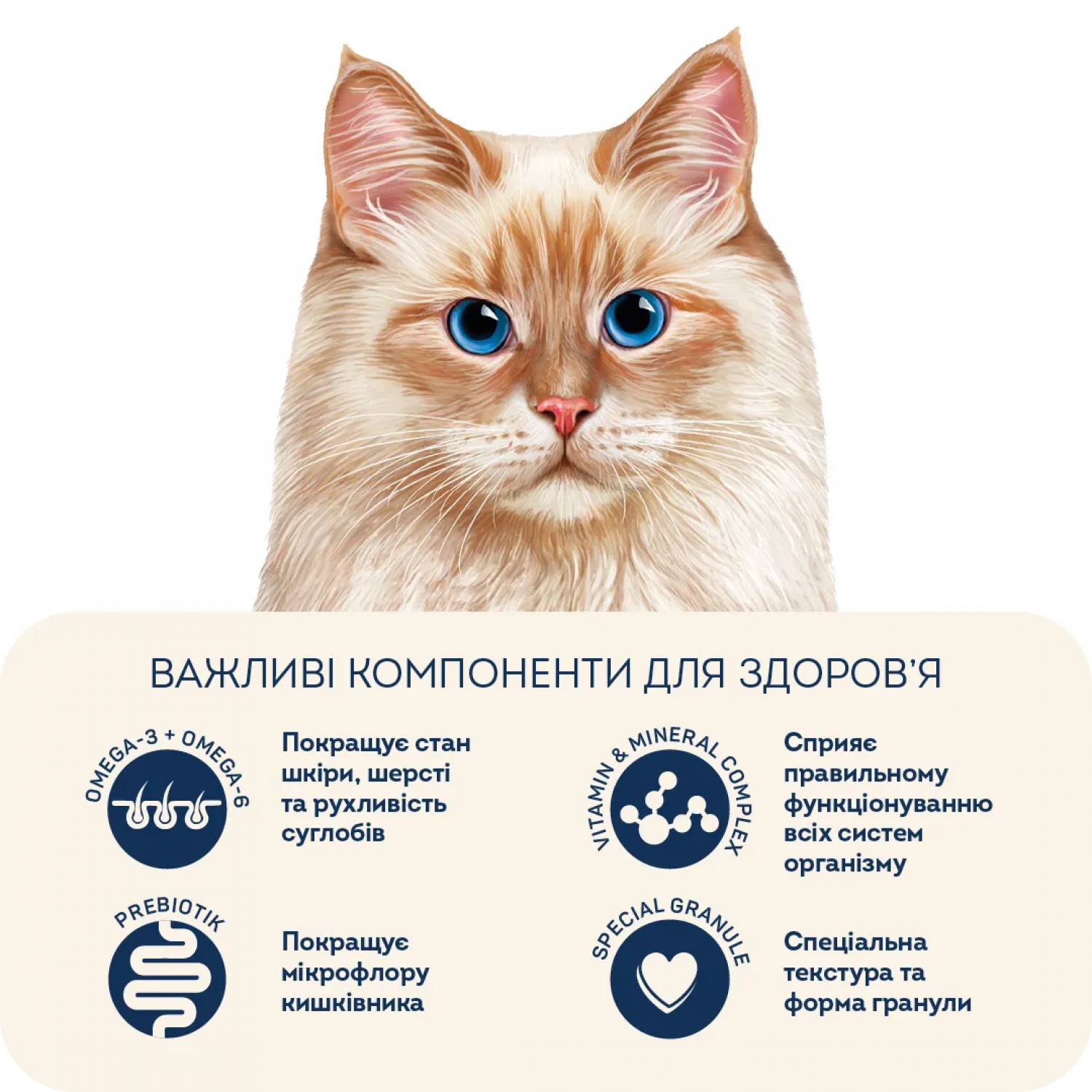 - Незамінна амінокислота таурин підтримує здоров'я серця та зір кота у будь-якому віці.