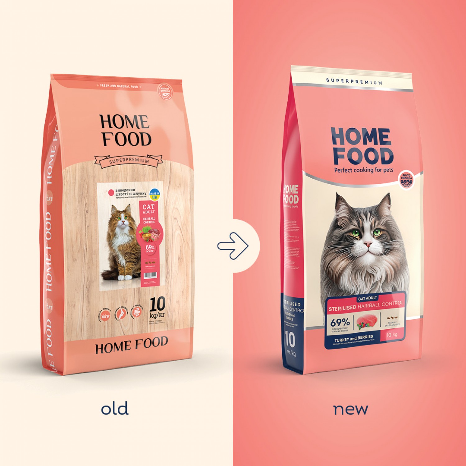 Home Food Cat Adult Hairball Control cухий корм для котів з ефектом виведення шерсті зі шлунку. Раціон на основі свіжого м'яса свійської птиці, яке є джерелом легкозасвоюваного тваринного білка та необхідних поживних речовин. Особлива форма гранули не подразнює шлунок, ефективно виводить шерсть і підходить тваринам зі слабкими яснами. Спеціальна формула корму для котів, що живуть в будинку, забезпечує відсутність запаху з лотка. Корм чудово підходить для довгошерстих порід котів, а також тваринам, які мають чутливий шлунково-кишковий тракт. Завдяки вмісту необхідних амінокислот, підходить для кастрованих котів та стерилізованих кішок. М'ясо птиці - дієтичне легкозасвоюване м'ясо з мінімальним вмістом жирів, тому підходить для тварин, схильних до набору зайвої ваги.