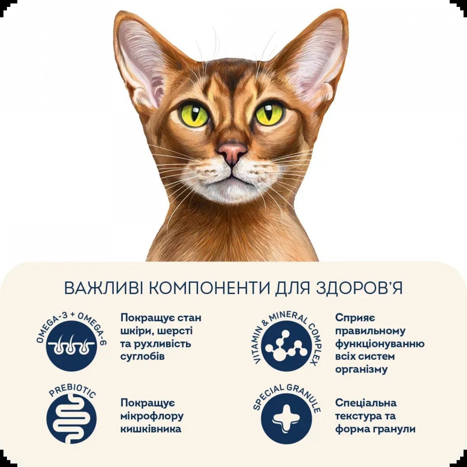 • Корм не містить зернової групи (кукурудза, пшениця, овес), тому є ідеальним вибором для котиків з непереносимістю цієї складової.
