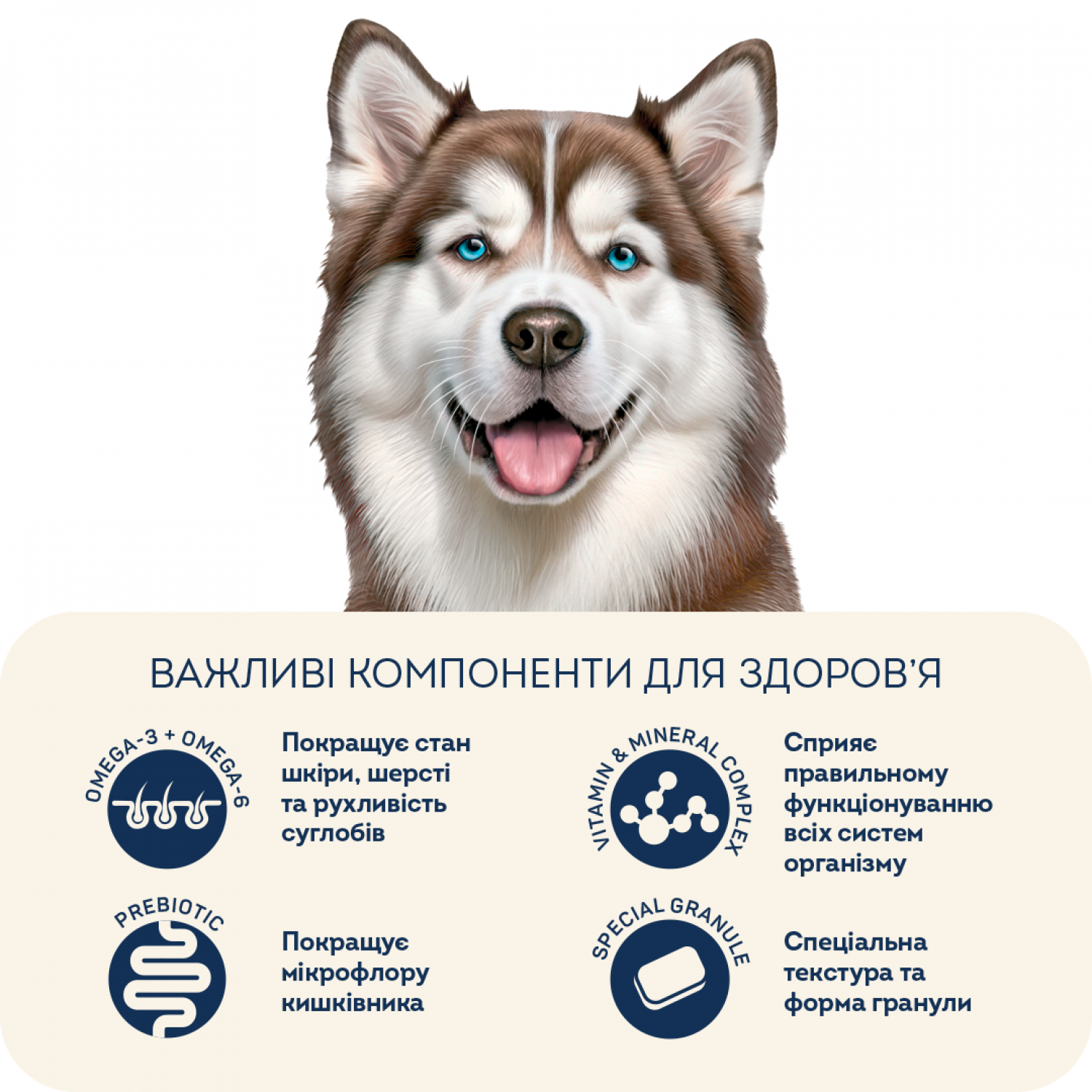 Рецептура розроблена спеціально для великих порід собак. Ідеальний вибір для порід з білим забарвленням. Завдяки ретельно підібраній протеїновій групі корм підходить для собак з чутливим ШКТ та схильністю до алергічних реакцій.