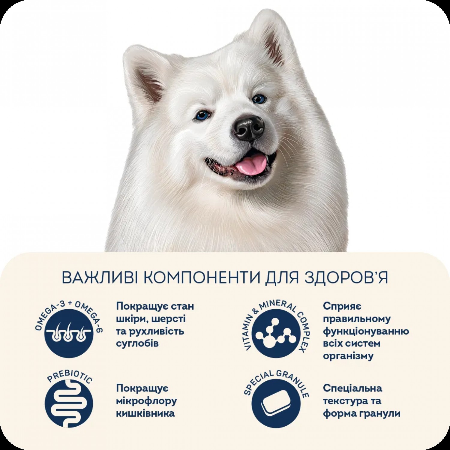 • Раціон з ідеальним співвідношенням високоякісних поживних речовин та оптимальним рівнем жирів розроблений спеціально для порід з білою шерстю.