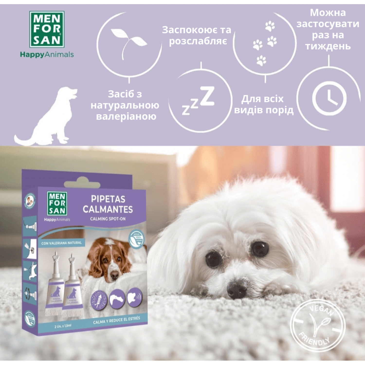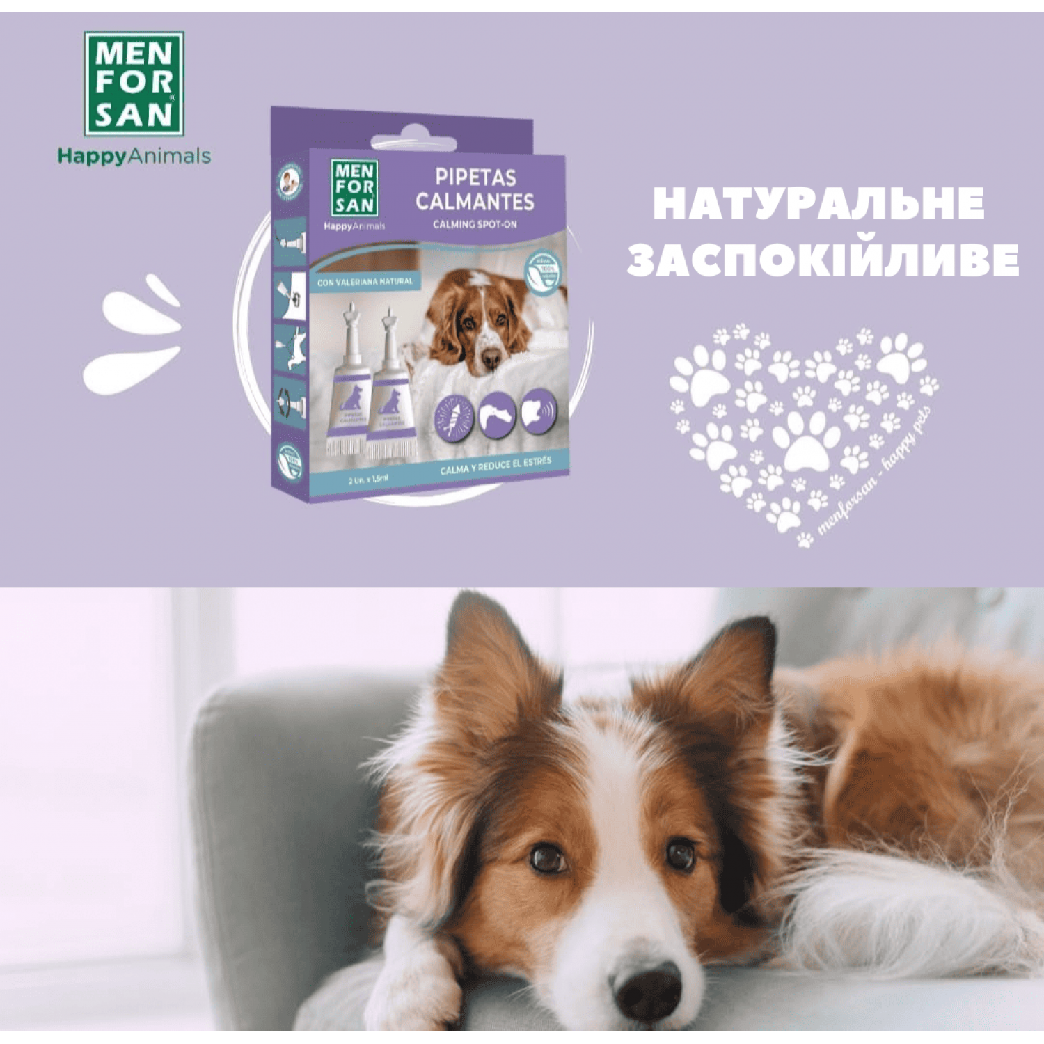 Антистресові заспокійливі краплі для собак з натуральним екстрактом валеріани. Валеріана – це рослина із заспокійливими та розслаблюючими властивостями, яка природним і дуже ефективним способом зменшує небажані поведінкові проблеми у собак. Краплями рекомендують вирішувати ситуації надмірного гавкоту, мітки сечею, поганої поведінки вдома, візитів до ветеринара, гучних звуків та інших подразників.