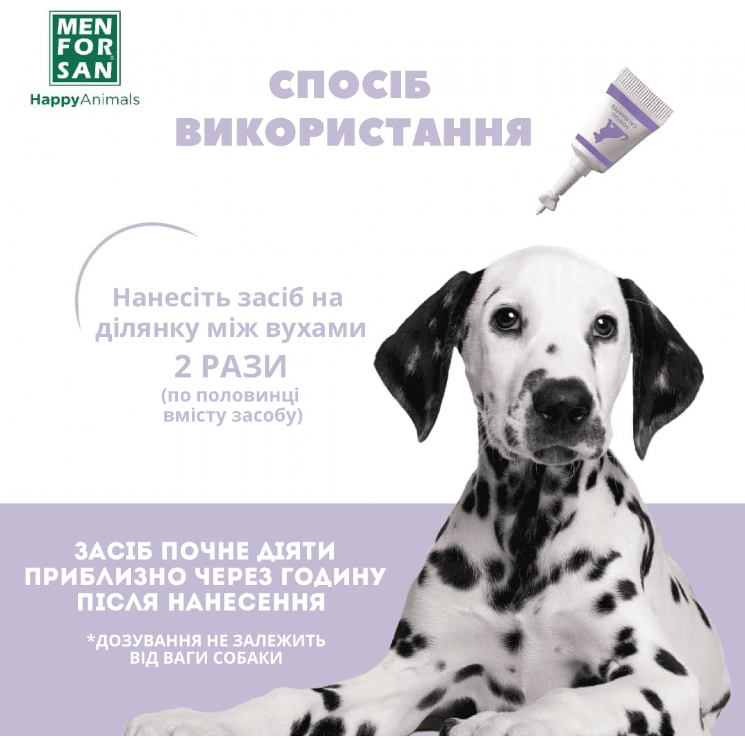 Цей продукт можна використовувати для всіх собак, незалежно від їх ваги. Після купання собаки рекомендується повторно застосовувати одну піпетку.