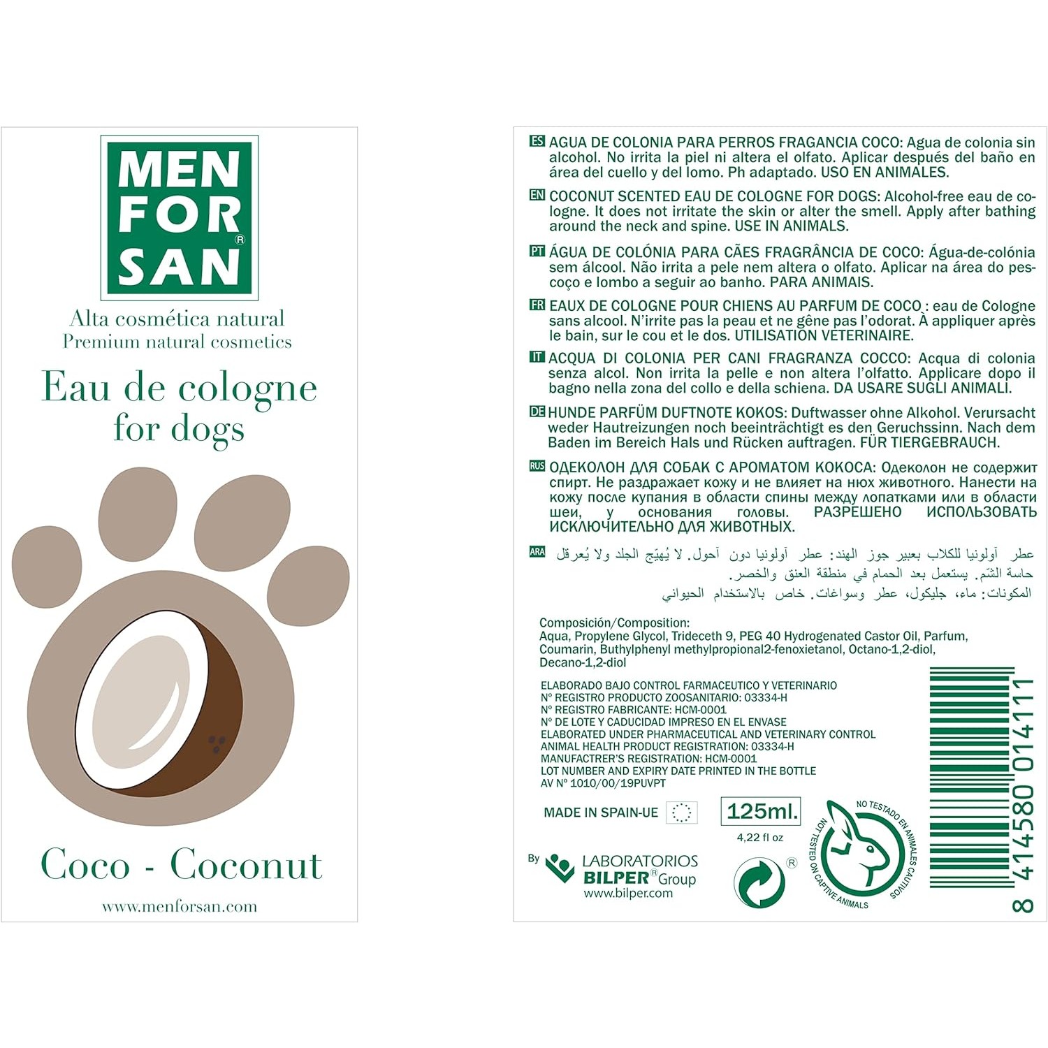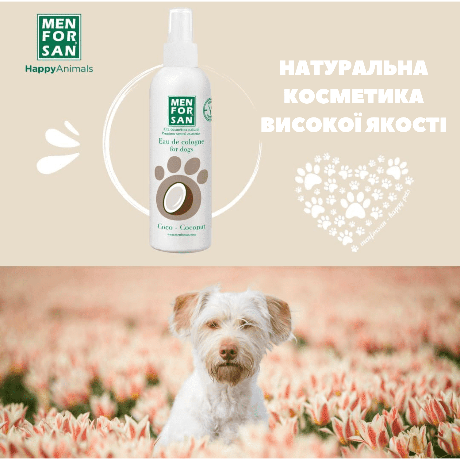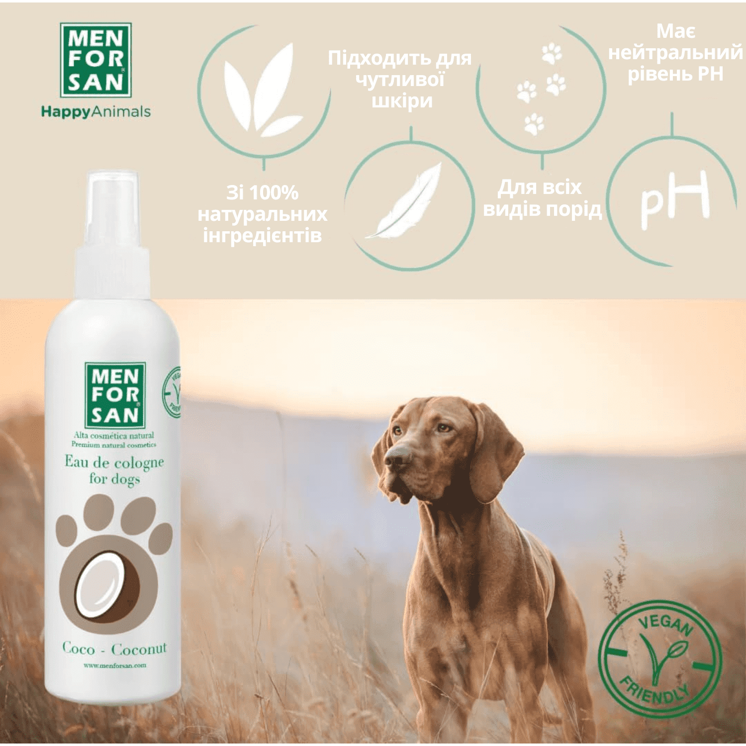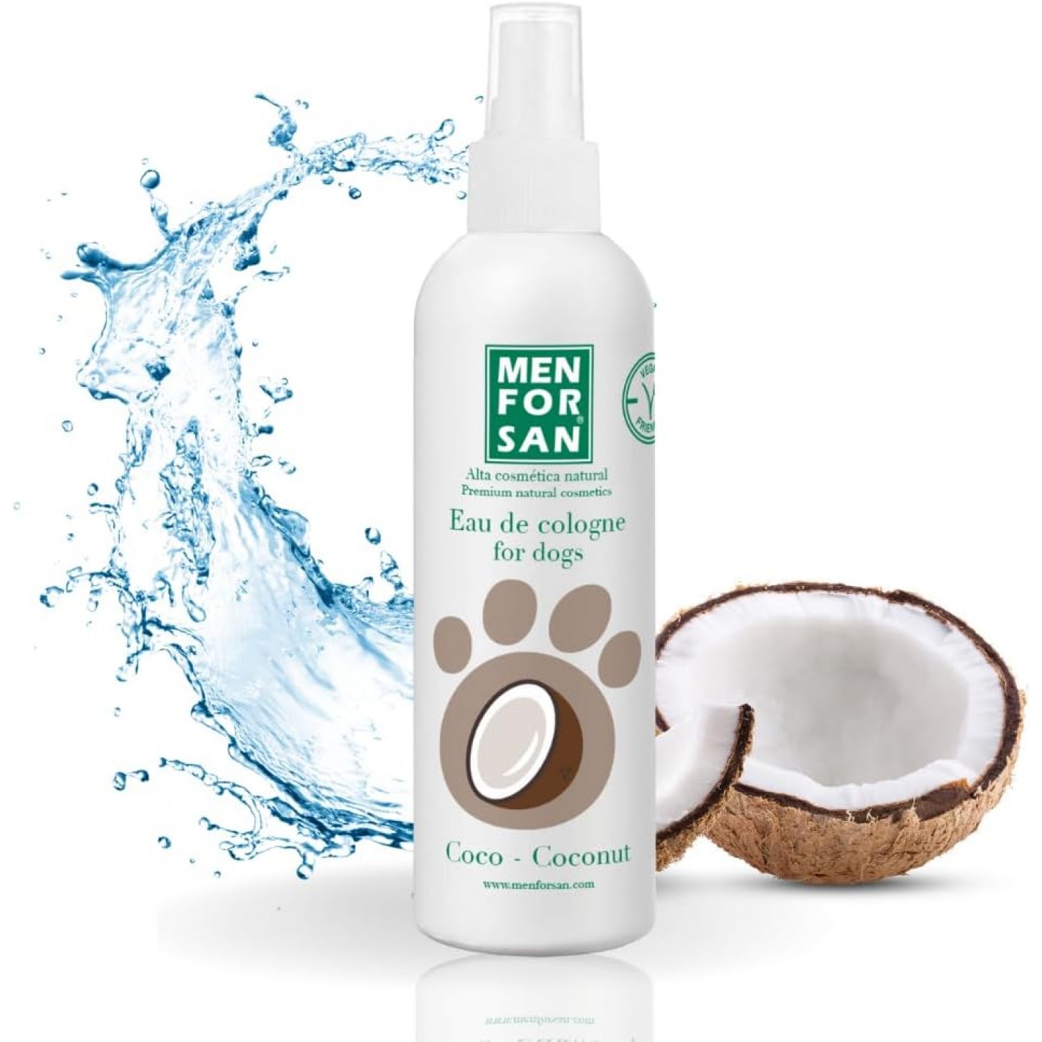 Натуральний одеколон для собак з ароматом КОКОСУ, створений спеціально для свіжого запаху після купання та інтенсивного дезодоруючого ефекту, який є дуже приємним, зберігаючи при цьому шкіру та нюхові властивості тварини.