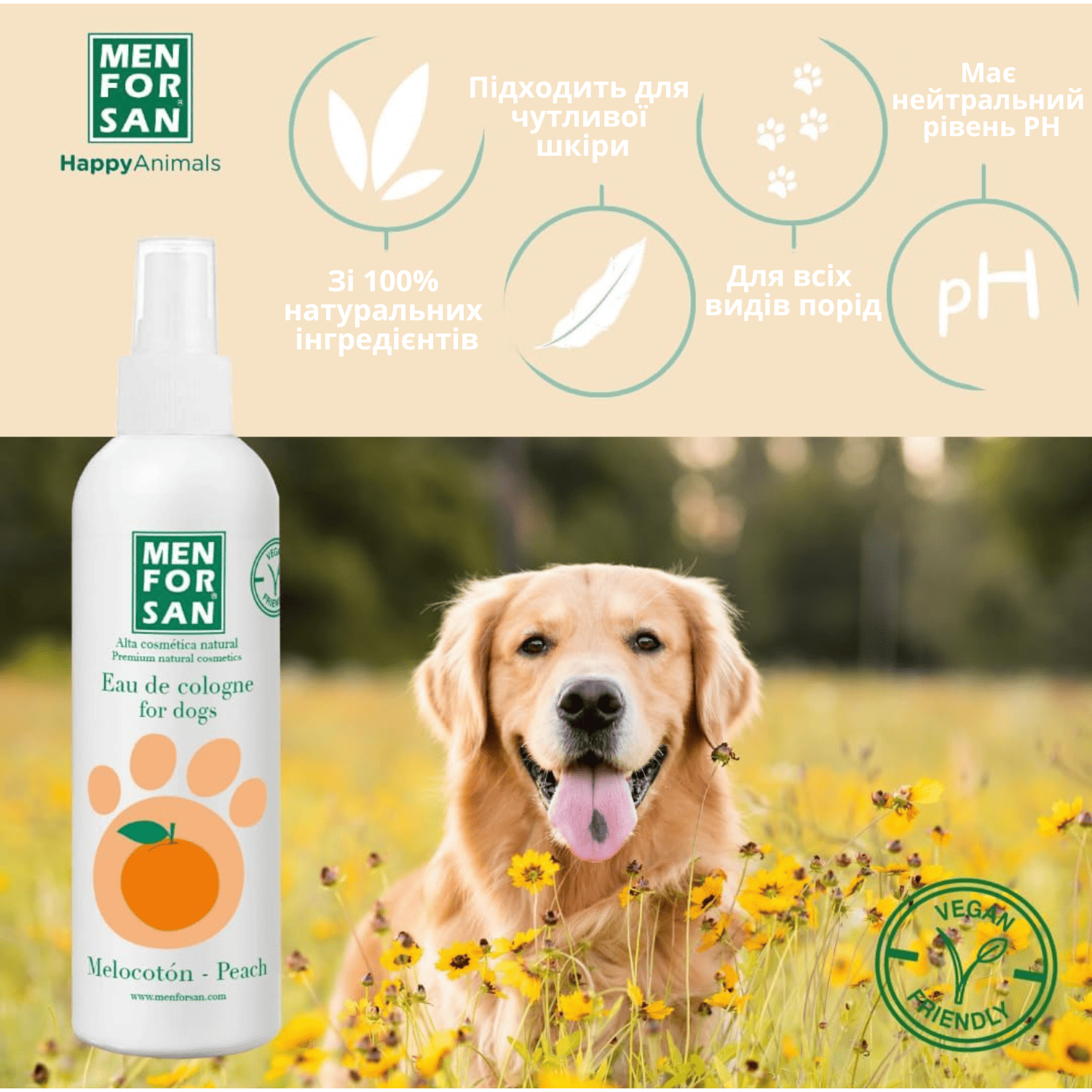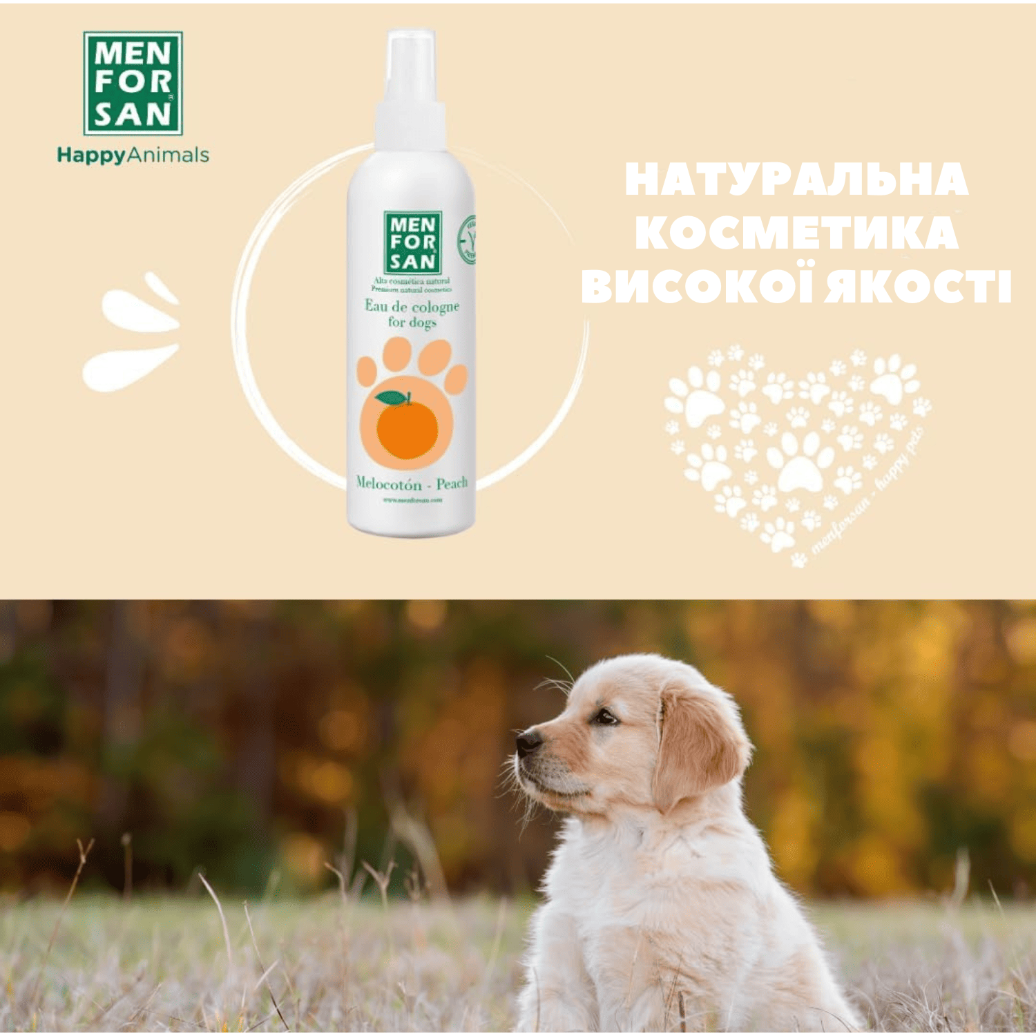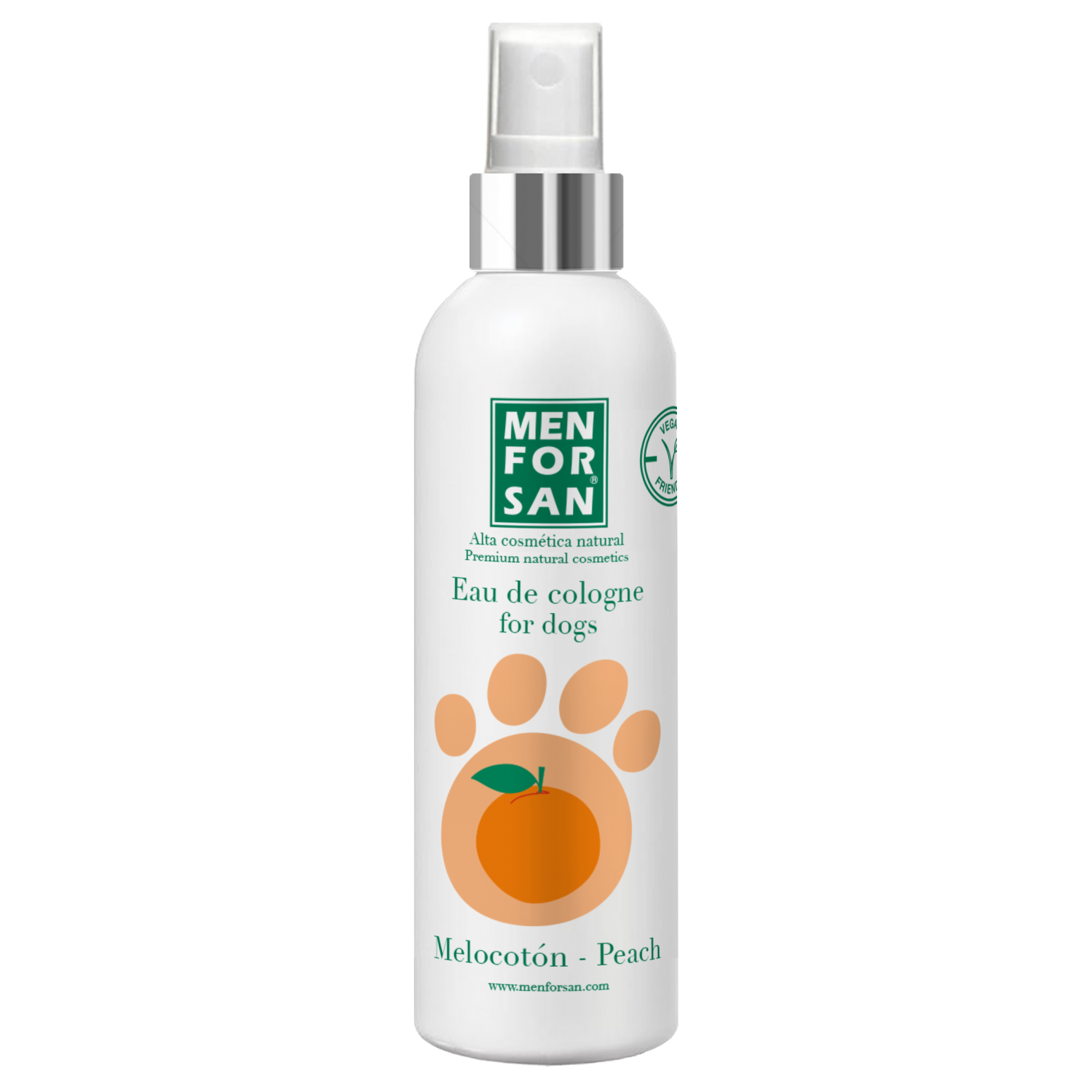 Натуральний одеколон для собак з ароматом ПЕРСИКА, створений спеціально для свіжого запаху після купання та інтенсивного дезодоруючого ефекту, який є дуже приємним, зберігаючи при цьому шкіру та нюхові властивості тварини.
