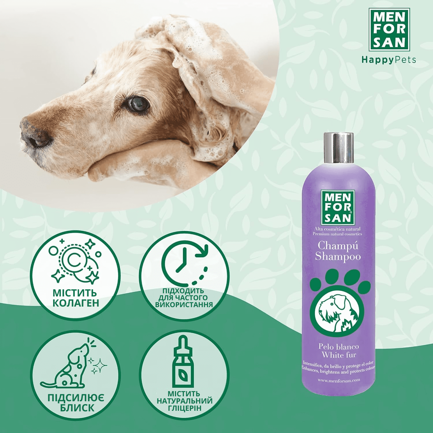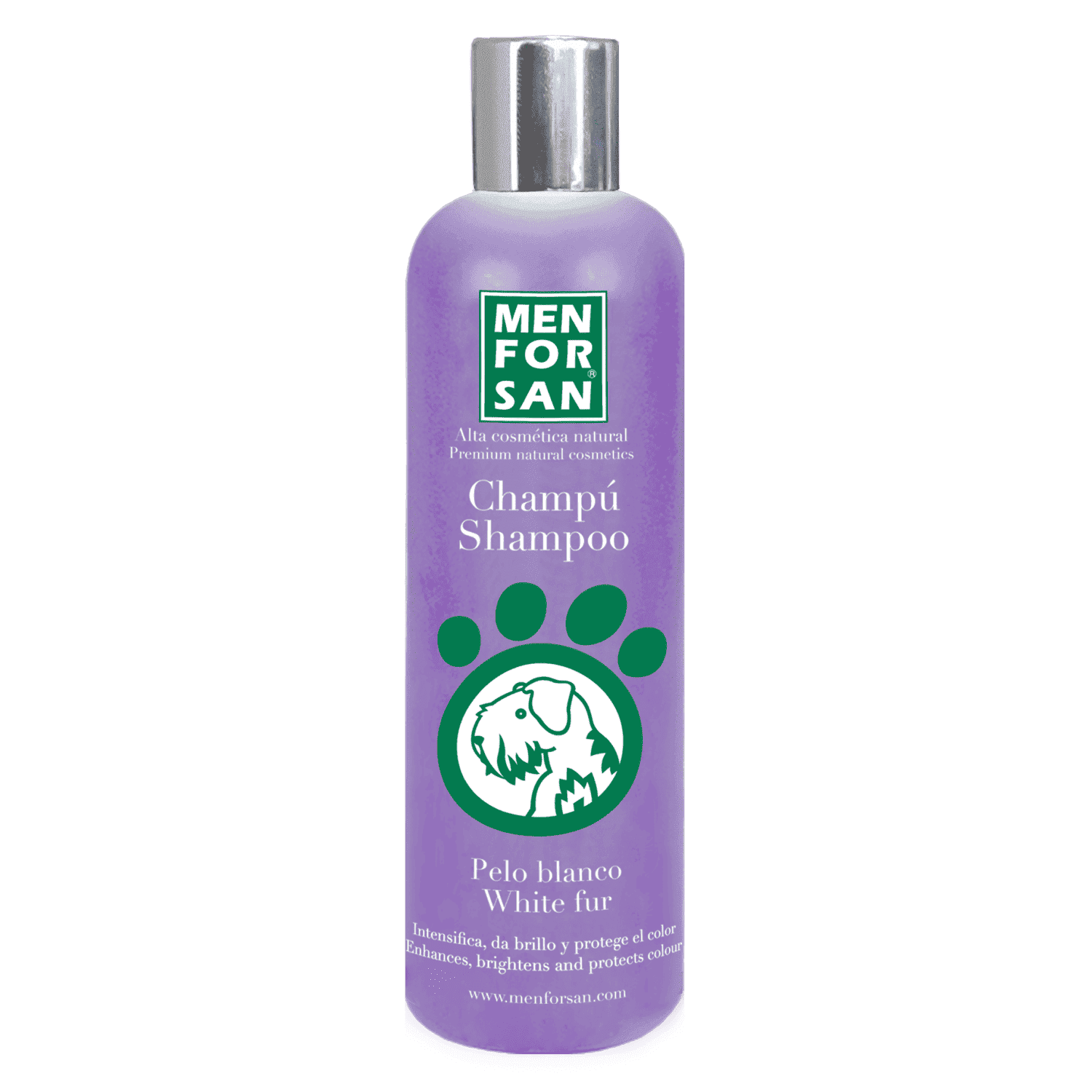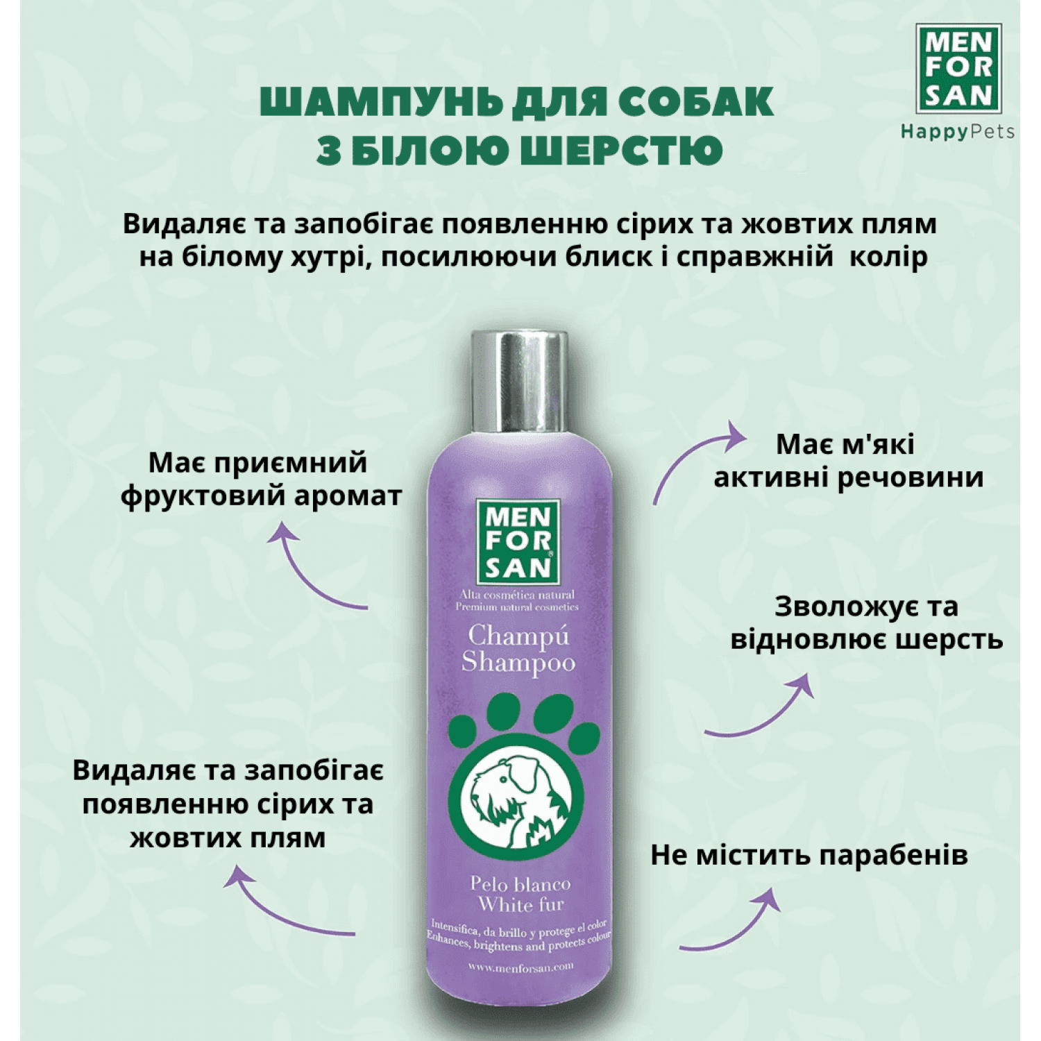 Натуральний шампунь, вищої якості для собак з білим та світлим хутром з фруктовим ароматом. Цей шампунь видаляє та запобігає появі непривабливих сірих і жовтих плям на білому хутрі, підсилюючи блиск та натуральний колір природним шляхом. Шампунь зволожує та відновлює здоровий і природний вигляд шерсті.