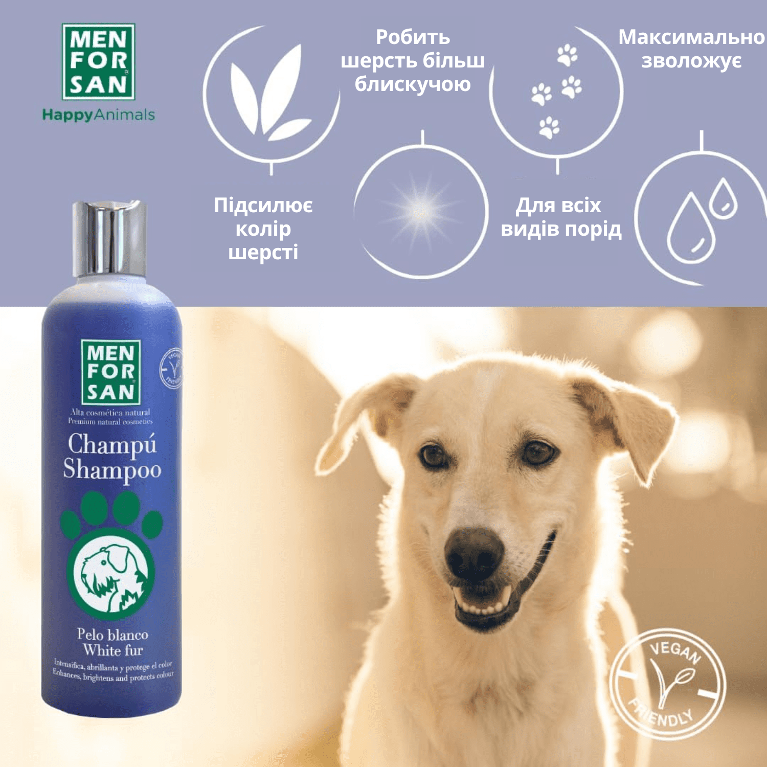 Шампунь для собак з білим хутром ідеально підходить для собак всіх типів білого хутра: