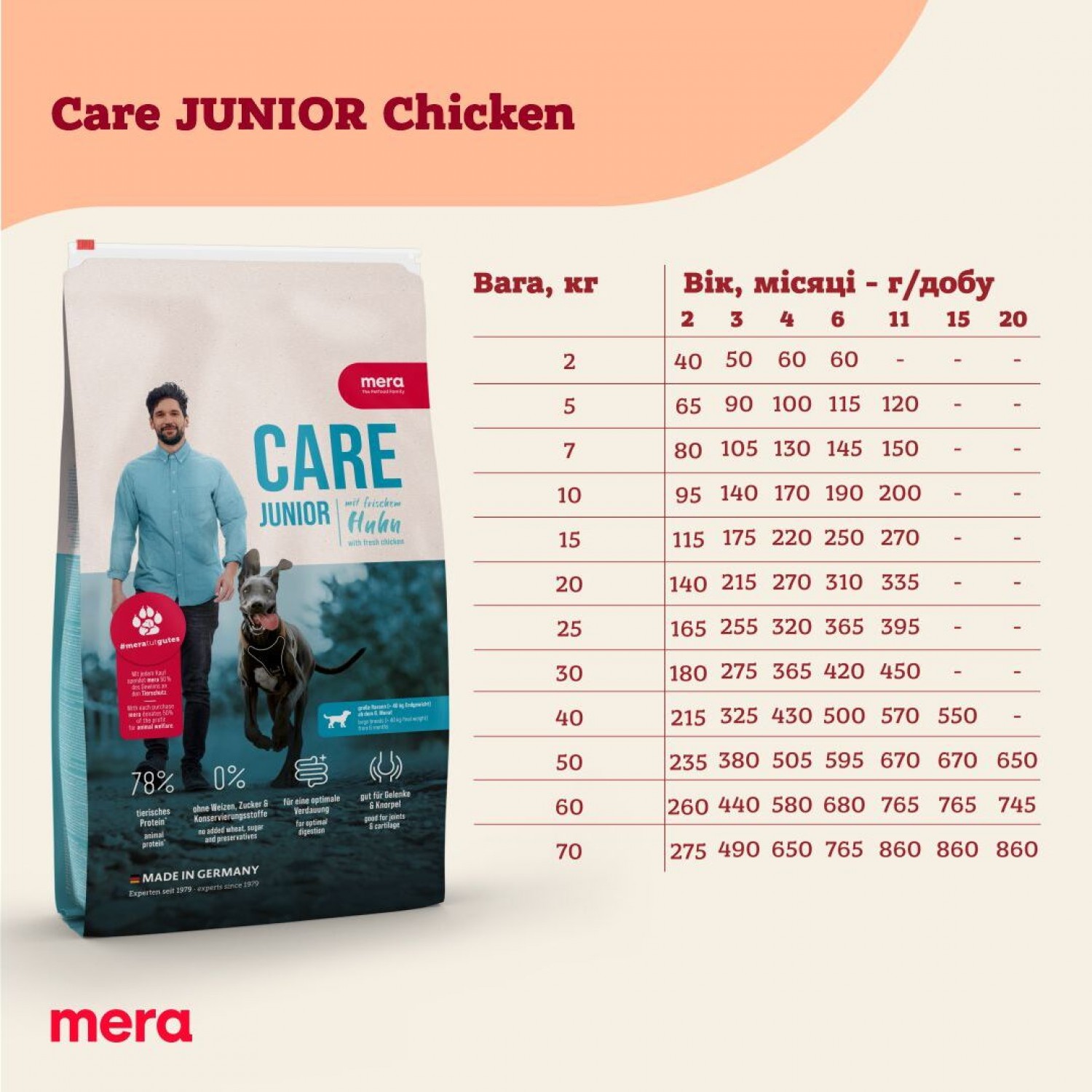 MERA Care Junior Chicken - сухий корм для зростаючих собак з куркою. Лінія продуктів MERA CARE це високоякісні корми для домашніх тварин, які спеціально адатовані до потреб вихованця. Велика кількість свіжого м'яса робить корм особливо смачним для собаки, а ретельно розроблена формула кожного рецепта задовольняє потреби більшості вихованців. Нове і найкраще для кожного улюбленця!