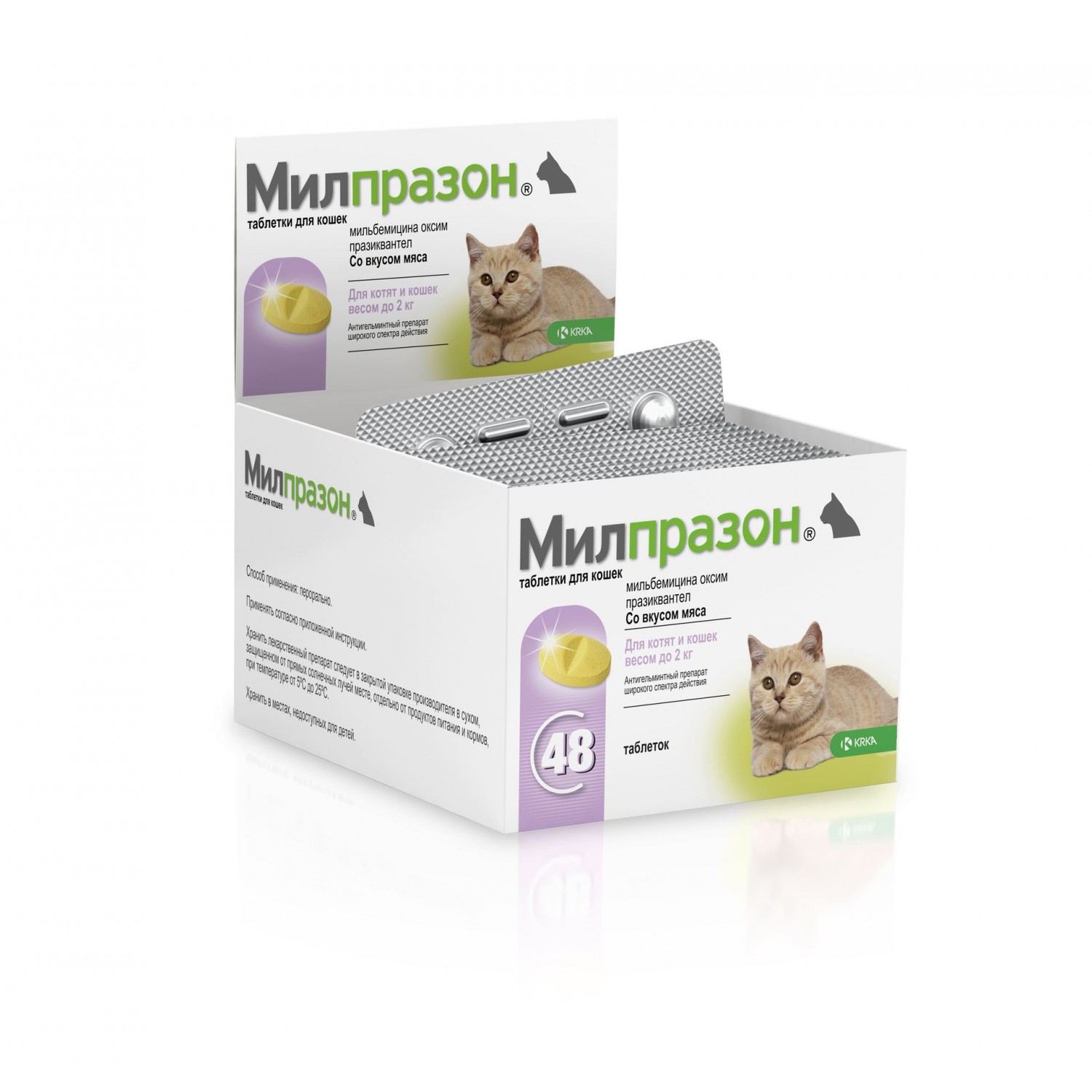 З лікувальною метою котів дегельмінтизують за показами, з профілактичною метою - щоквартально, а також перед кожною вакцинацією і паруванням у терапевтичній дозі. Одноразова терапевтична доза препарату захищає котів від зараження Dirofilaria immitis впродовж одного місяця. Для наступної профілактики дирофіляріозу доцільно застосовувати препарат із вмістом однієї діючої речовини мілбеміцину оксим.
