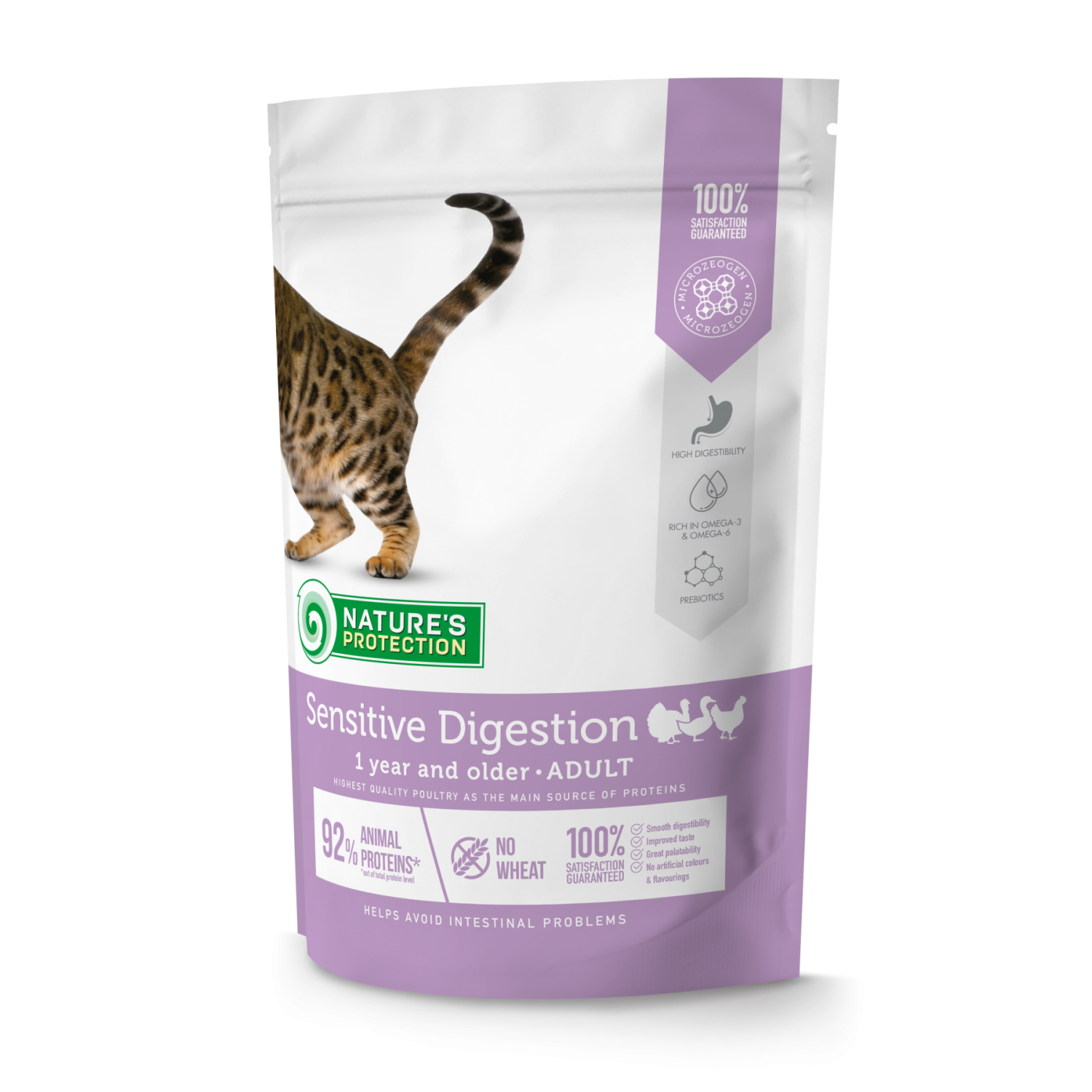 Nature's Protection Sensitive Digestion Adult – повнораціонний, збалансований сухий корм для дорослих котів (від 1 року і старше), що покращує роботу шлунково-кишкового тракту. Легкозасвоюваний корм має приємний для тварин смак. Оптимальне поєднання тваринних білків та вуглеводів (картопля, ячмінь) сприяє легкому травленню. Екстракти рослин, харчові добавки та натуральні харчові волокна також покращують роботу шлунково-кишкового тракту вихованця. Корм не містить генетично модифікованих продуктів та штучних барвників.