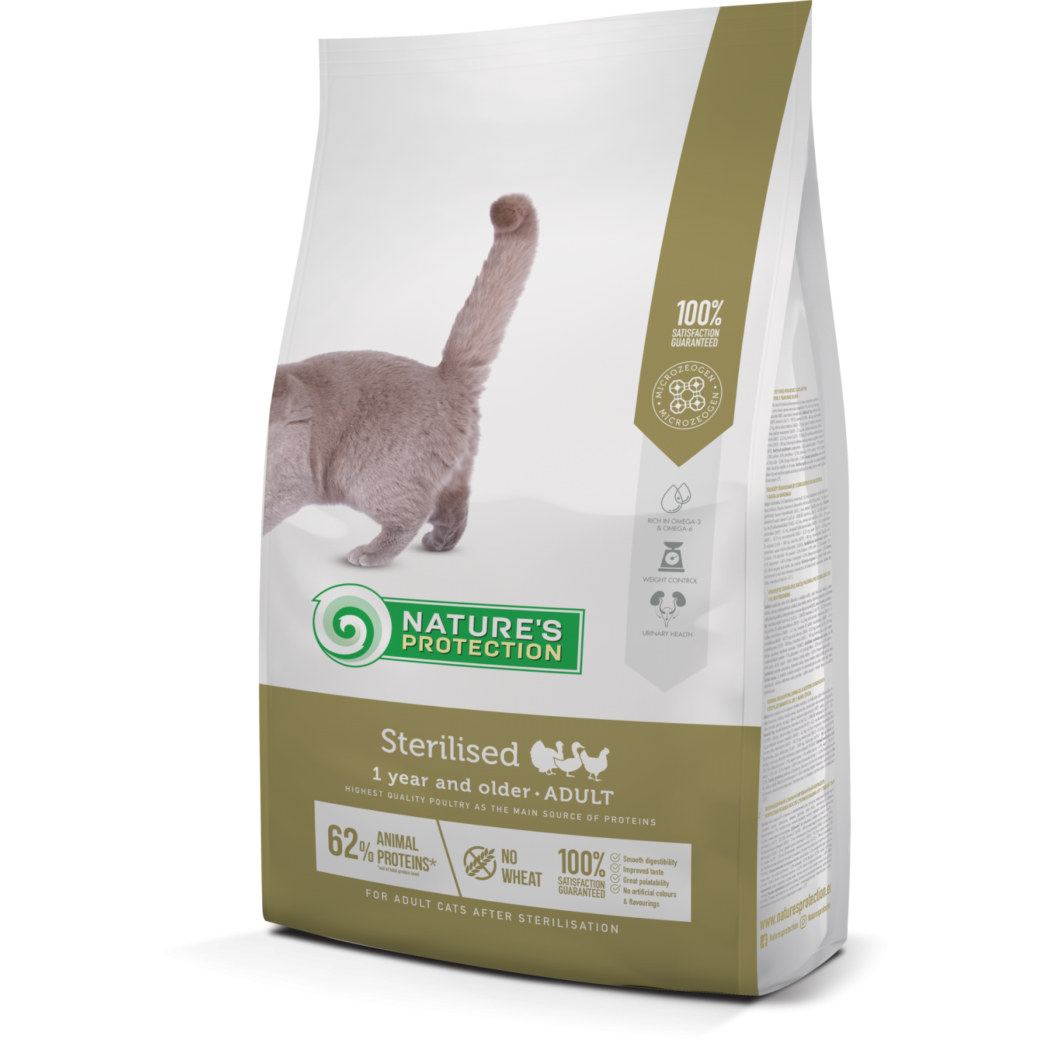 Nature's Protection Sterilised Adult – повнораціонний сухий корм для дорослих стерилізованих кішок та кастрованих котів. Оптимально збалансована формула корму зі зниженою кількістю жирів та L-карнітином допомагає врегулювати вагу та перешкоджає подальшому накопиченню надлишкової маси тіла Вашого вихованця.