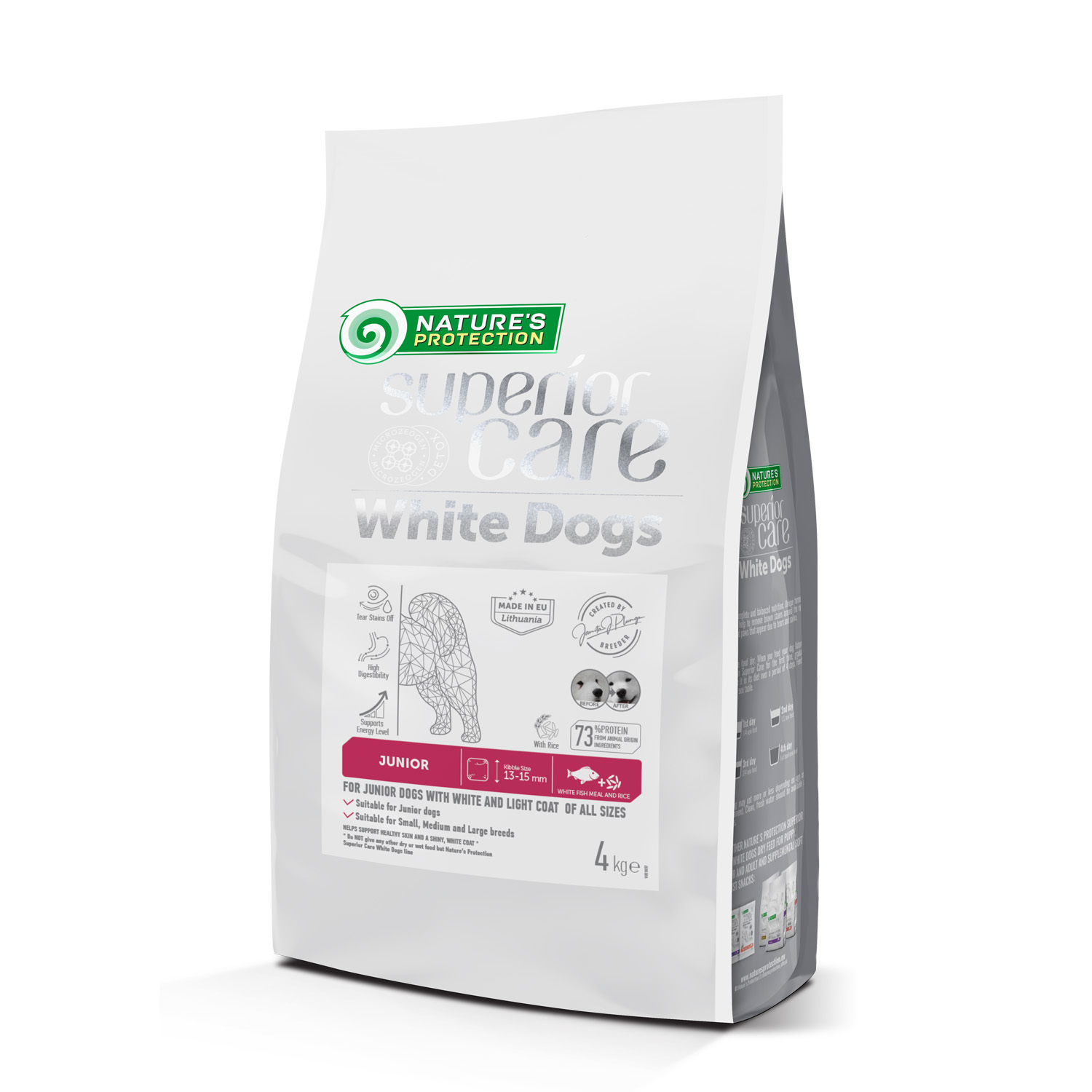 Серія сухих кормів Nature’s Protection Superior Care White Dogs розроблена спеціально для вирішення таких проблем, як потемніння шерсті в області очей та інших частинах тіла домашнього улюбленця, борідки, лапок тощо. Корм містить тихоокеанську тріску, мерланг та атлантичну тріску, відомі своїми гіпоалергенними властивостями. Більше того, у білій рибі, порівняно з будь-якою іншою рибою, міститься більша кількість вітамінів А та D, які особливо необхідні для підтримки загального здоров'я собаки. Корми з лінійки Nature’s Protection Superior Care White Dogs підходять усім собакам, незалежно від забарвлення шерсті та не впливають на її колір. Включення цього корму до раціону собак із темним забарвленням шерсті не призводить до її висвітлення або зміни кольору.