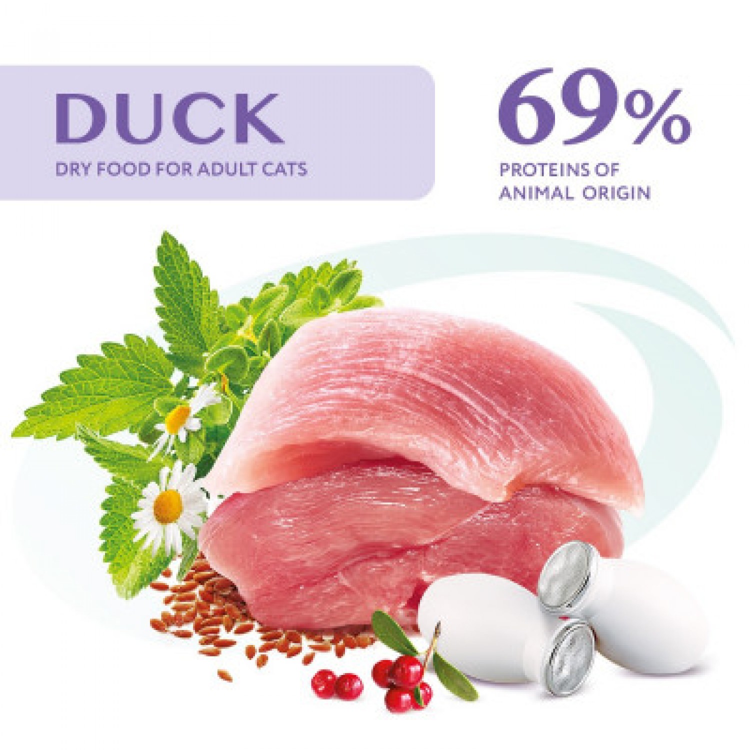 - Свіже м’ясо качки у вигляді фаршу забезпечує кота високоякісним легкозасвоюваним протеїном тваринного походження, що сприяє здоровому травленню.