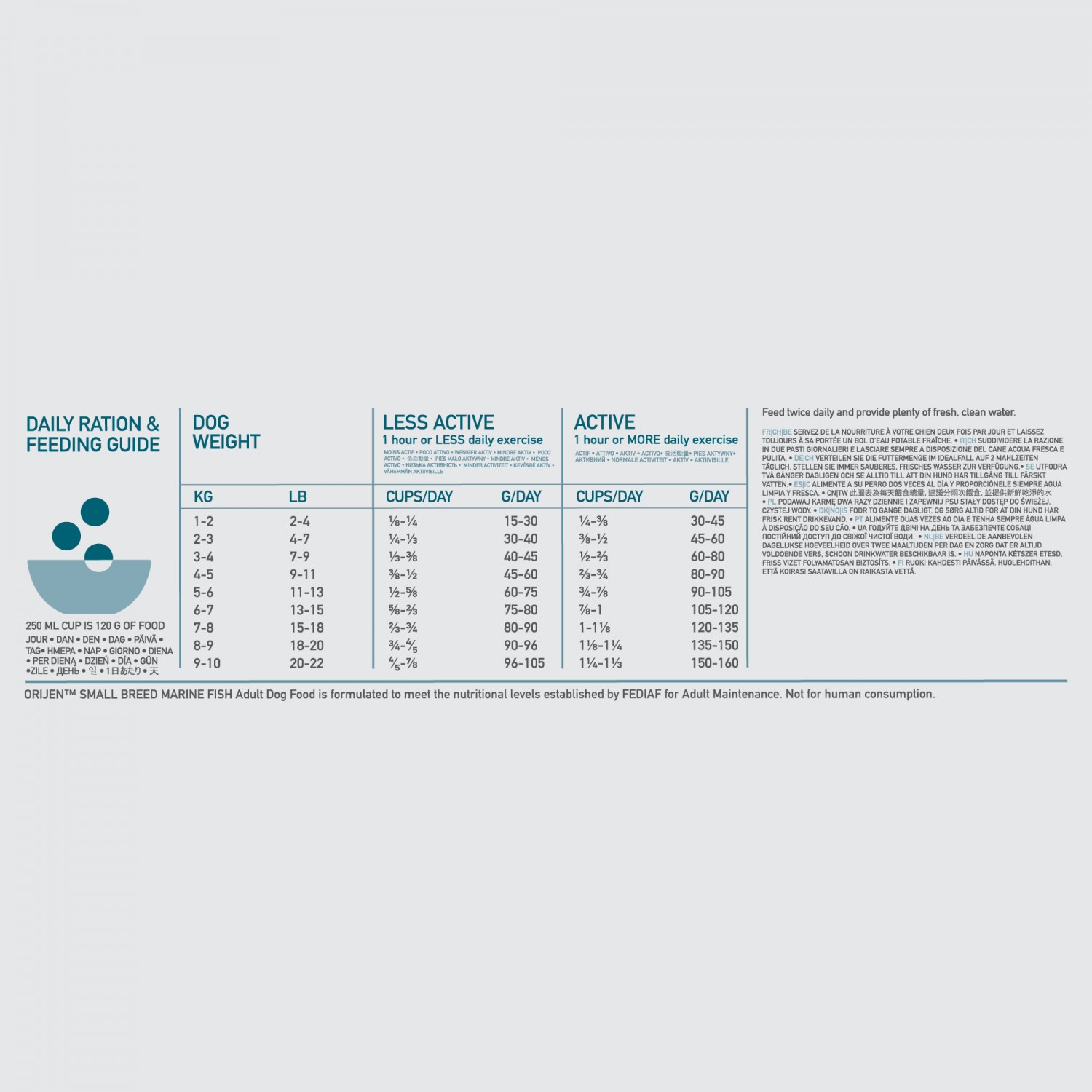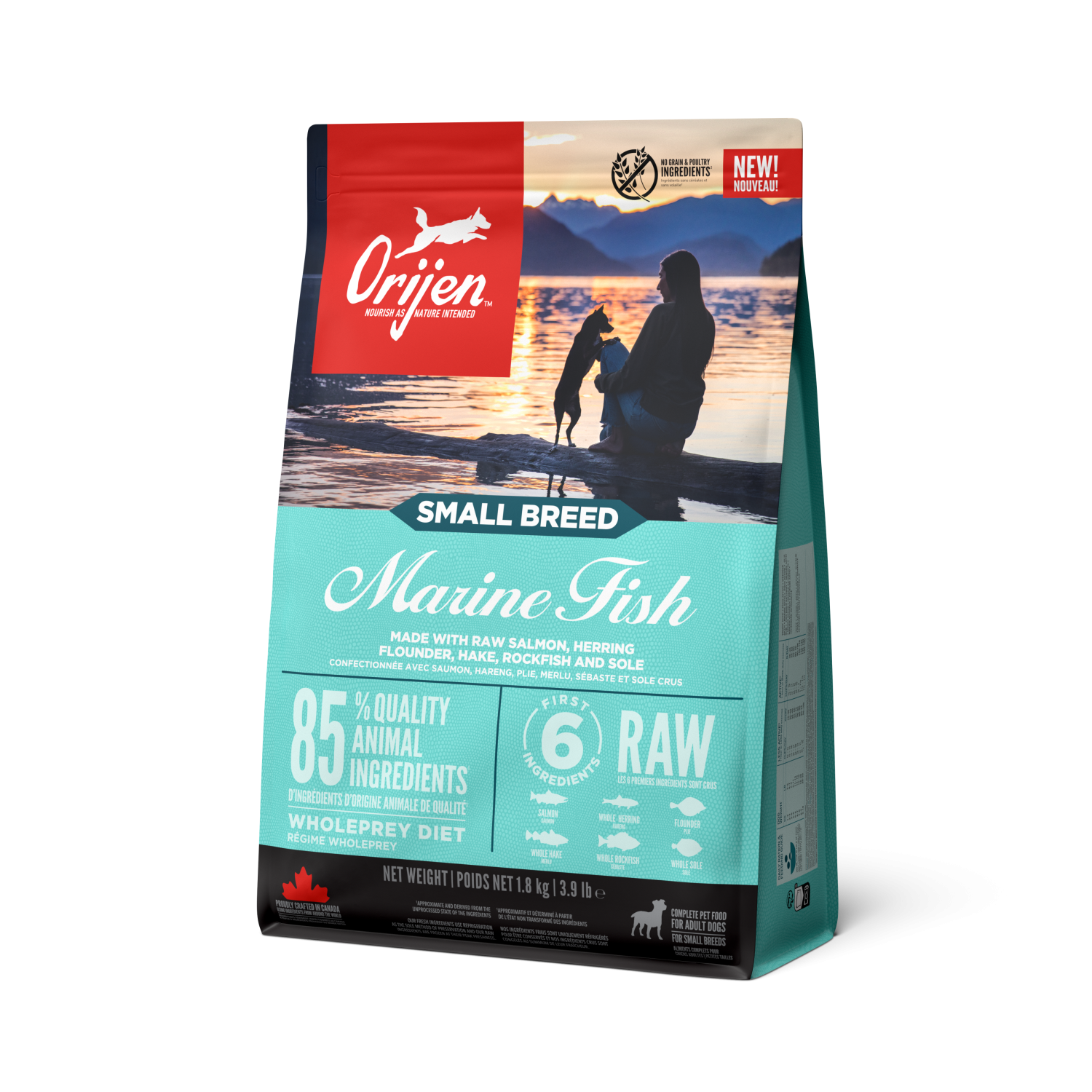 - Orijen Small Breed Marine Fish створений спеціально для собак, які надають перевагу смаку риби, або мають харчову чутливість до м'яса птиці.