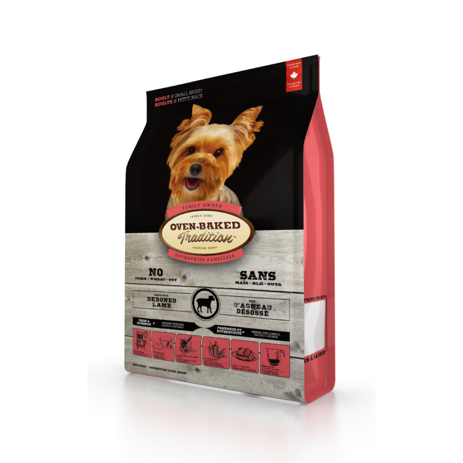Склад: Свіже м’ясо ягня без кісток 13.9%, Дегідроване м’ясо ягня 13.0%, Овес, Коричневий рис, Ячмінь, Жито, Дегідроване м’ясо риби, Олія каноли, Гороховий білок, Насіння льону, Висушений яєчний порошок, Масло лосося, Горох, Морська сіль, Екстракт Юкка Шідігера, Інулін (пребіотік), Глюкозамін гідрохлорид, Хондріотин сульфат, Шпинат, Яблука, Банани, Чорниця, Броколі, Журавлина, Сушені водорості, Солодка картопля, Екстракт розмарину.