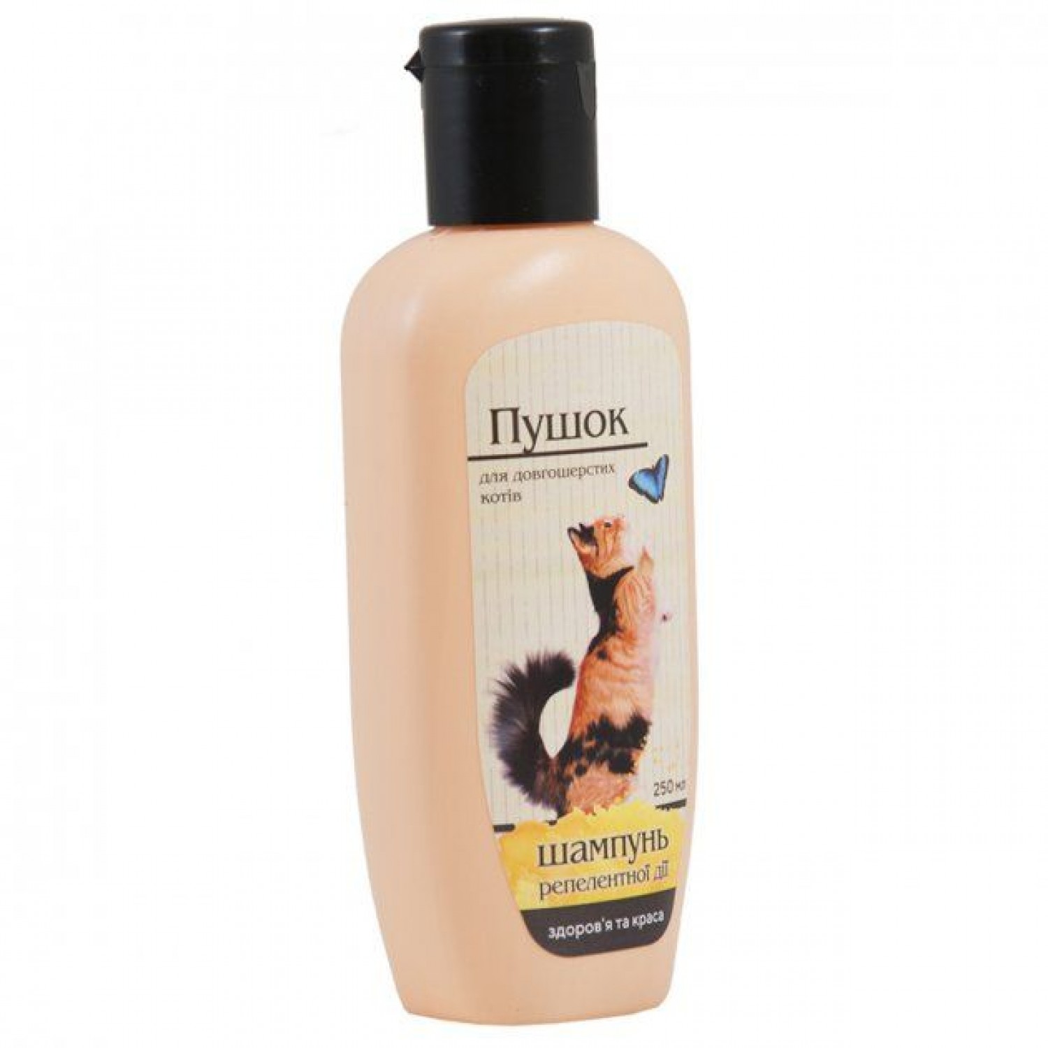 Гігієнічний шампунь для довгошерстих котів «Пушок» має репелентну дію проти бліх, кліщів та інших ектопаразитів. Репелентний ефект досягається завдяки унікальному поєднанню лікарських трав. Шампунь знімає подразнення, пом’якшує та тонізує шкіру, сприяє загоюванню розчосів, надає шерсті здорового блиску та м’якості. Засіб не пересушує шкіру при частому використанні.